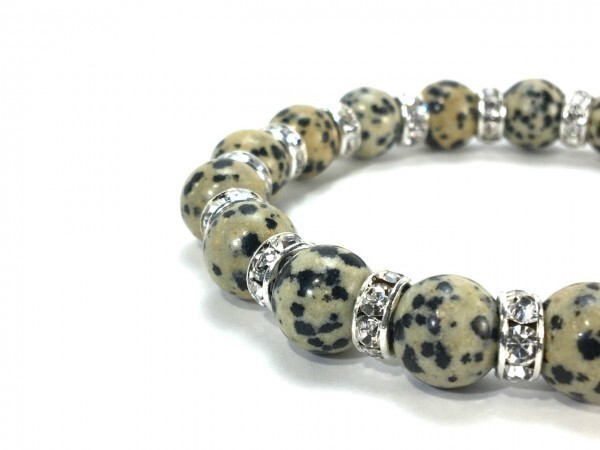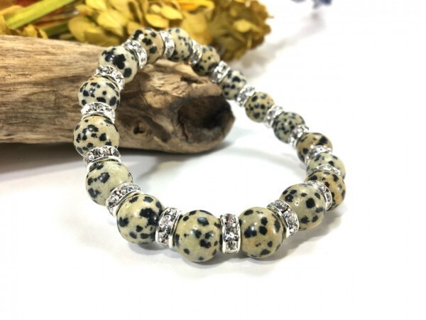 こちらは、10mm玉のダルメシアンジャスパーを使用したパワーストーンブレスレットです。間にはロンデルを挟み高級感あるブレスレットに仕上げています。石大きさは腕にも馴染みやすいように10mm玉を使用して、サイズは内径約18cmです。(サイズ調節も無料で承っています。サイズ変更の場合は落札後、取引ナビにてご一報くださいませ。) 数に限りがございますので気になる方はお早めにどうぞ。