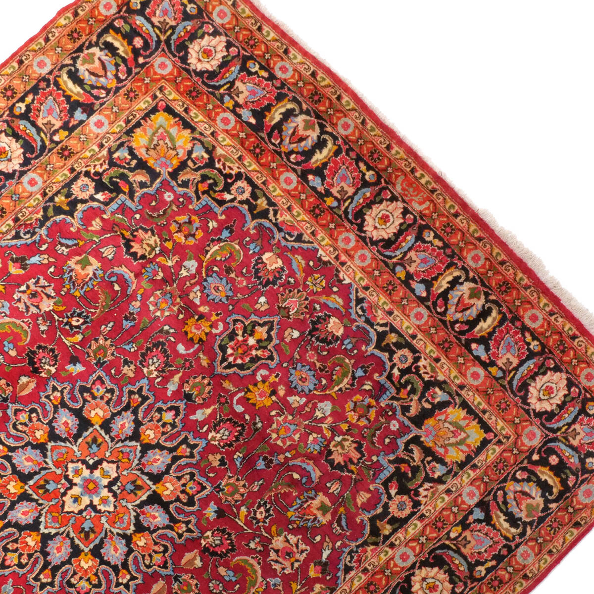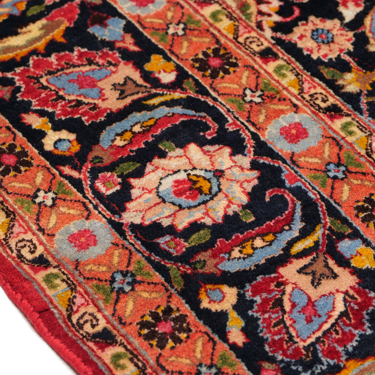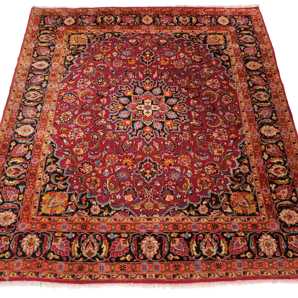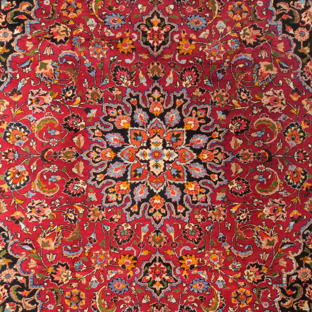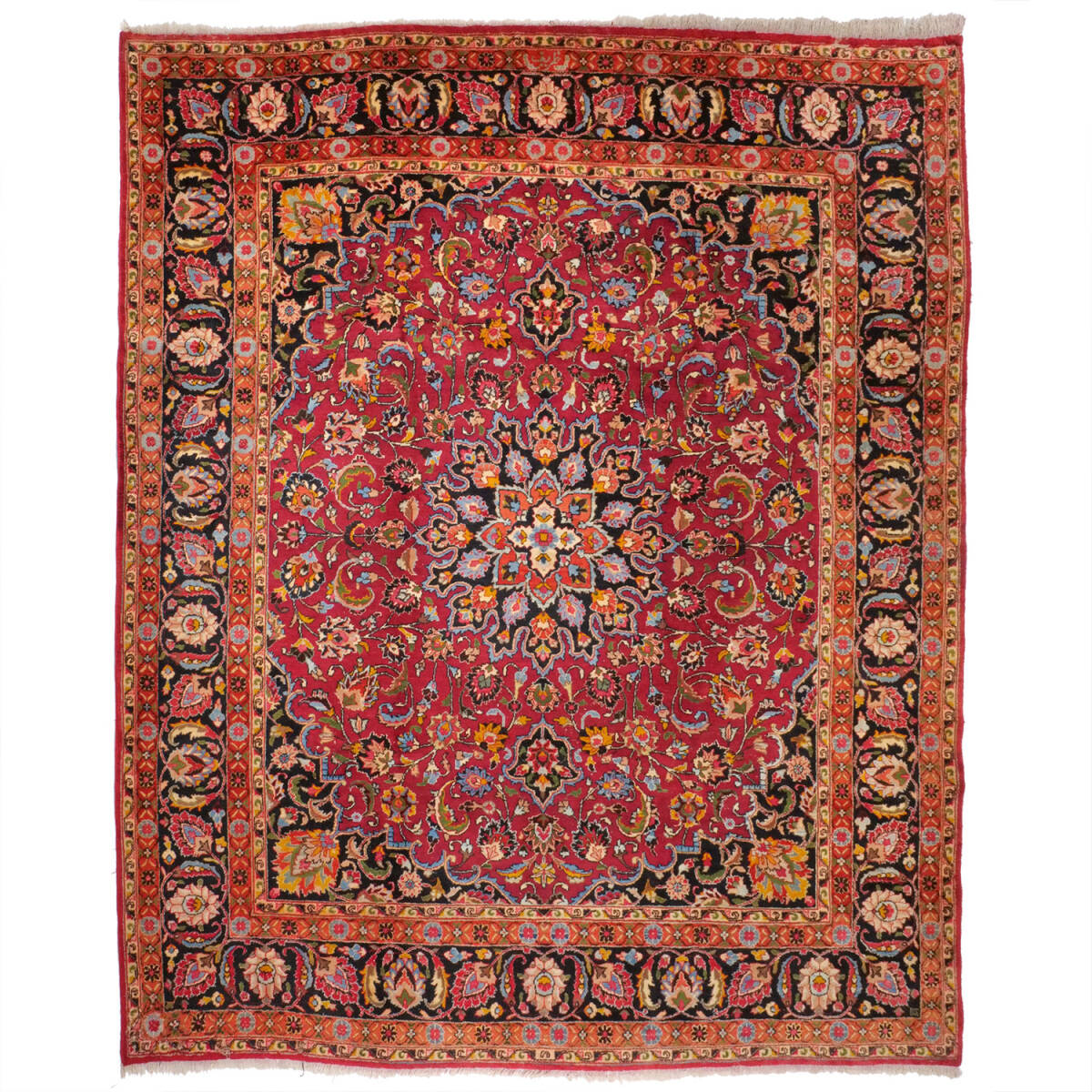1960年代に手織りされたマシャッド産のセミアンティークラグです。サイズは3020×2500mmで、リビングやダイニングなどの広い空間にふさわしい堂々とした一枚です。