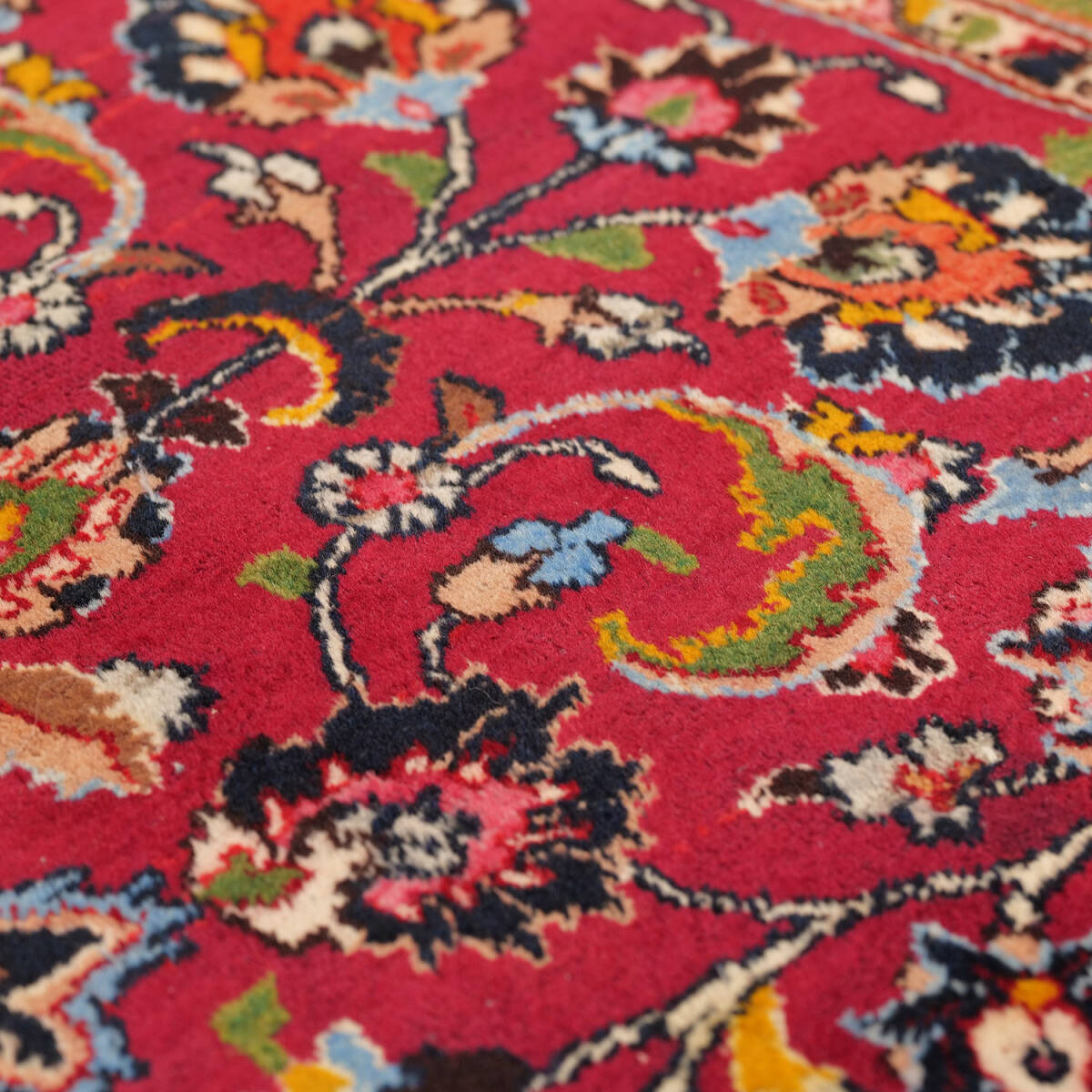 ボーダー部分には連続する花と蔓草が流れるように描かれ、中央のメダリオンを引き立てています。多彩な色調の中に秩序と調和が息づき、マシャッド絨毯の格式高い美が際立つ逸品です。