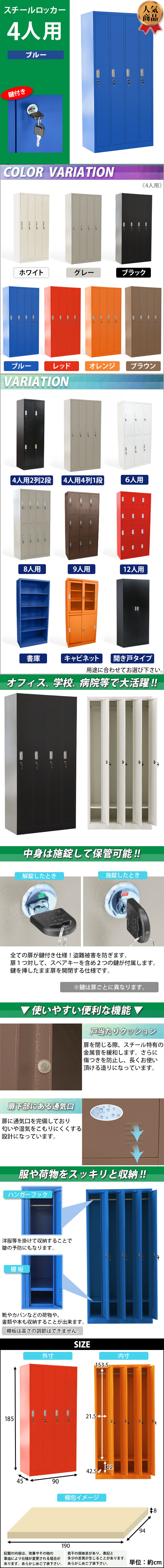 | 商品サイズ | ■本体寸法 約W 90×約D 45×約H 185(cm)(鍵は、合計8(内スペアキー4)個付属します。) ■ロッカー(内寸) 上段:約W 21.5×約D 42.5×約H 153.5(cm) 下段:約W 21.5×約D 42.5×約H 22(cm) ■梱包荷姿 約W 190×約D 94×約H 8(cm)/約50kg |
