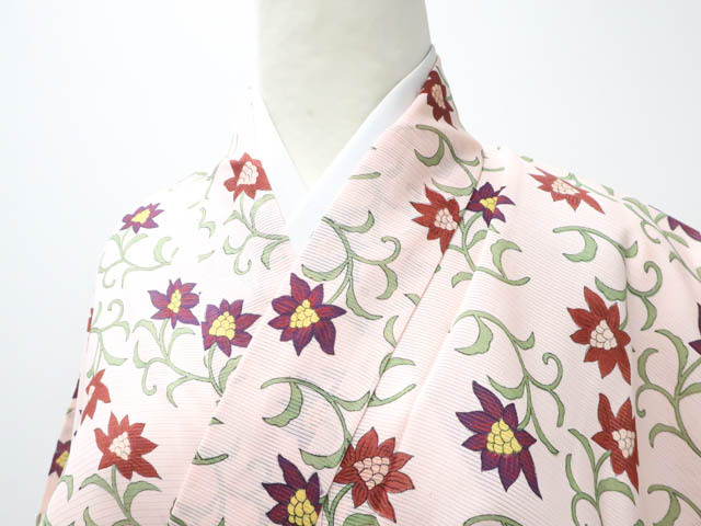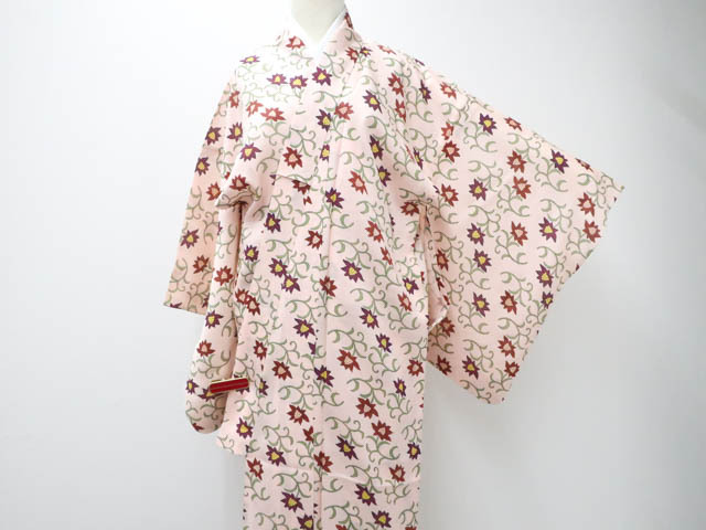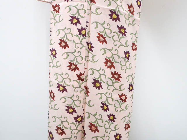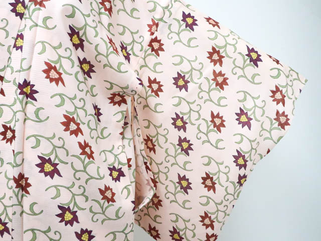 リサイクル商品のため、後身頃など表の全体に薄いシミがございますが着用可能なお品です。 地色はピンクです。 1枚目の画像が近いお色かと思われます。 素材は正絹です。 |