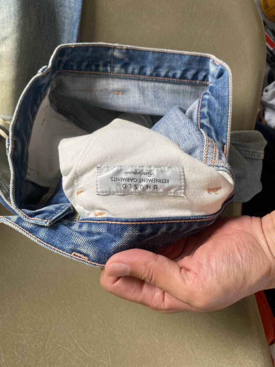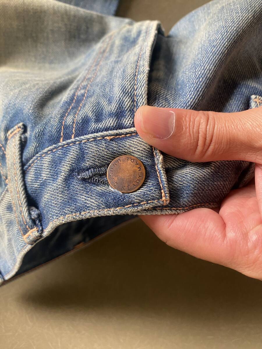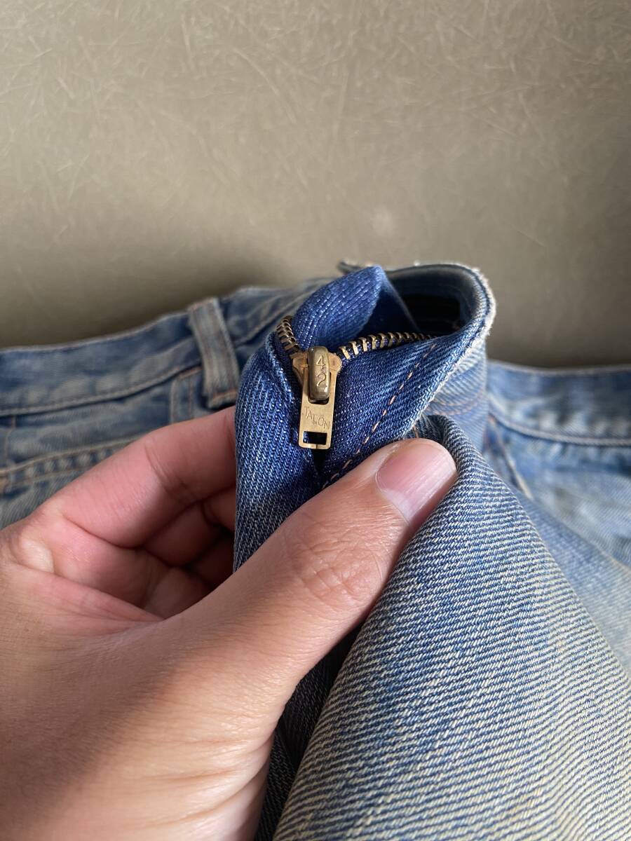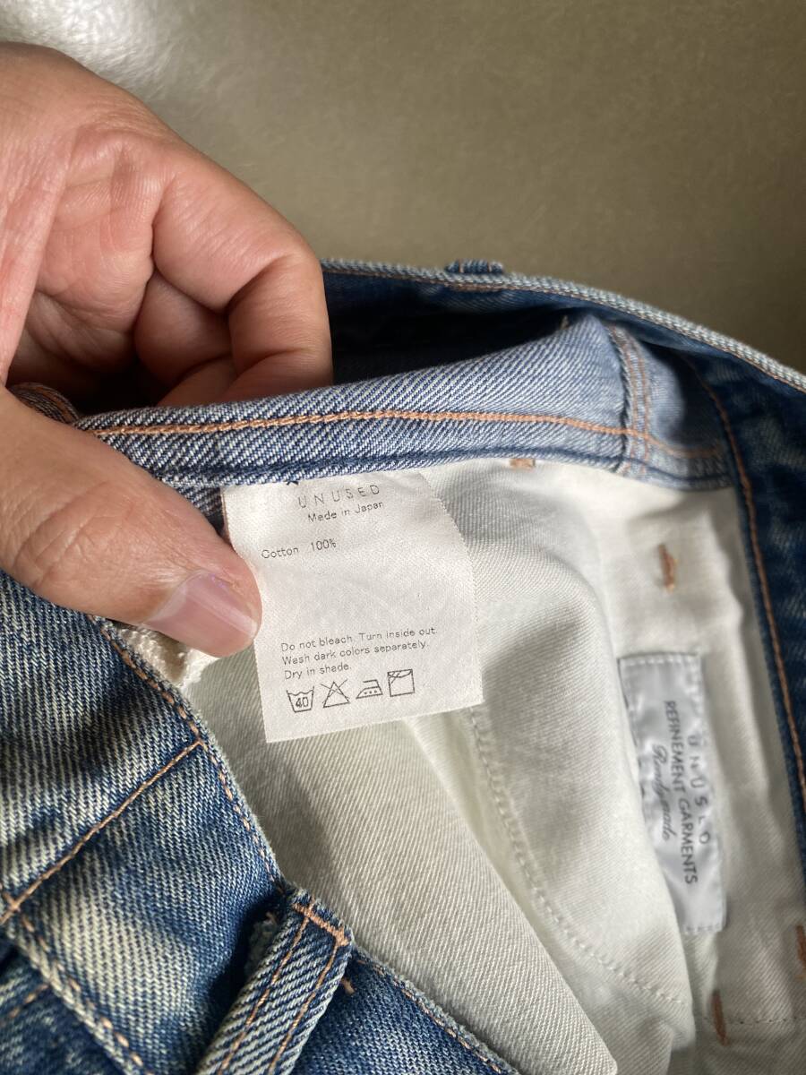 ほつれ、デニムの色味、黄ばみ、など元々の加工です