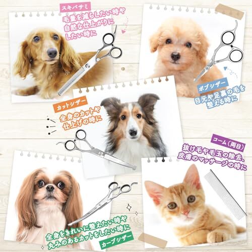 【初心者におすすめ!】ペットのおうちカット初心者でセット品を購入しようかどうか迷っている方にオススメです!すきばさみは、少しずつ被毛をカットしていけるので、全体的に毛量を減らしたいときやラインをぼかして整えたい時などに使用します。特に、失敗しにくいハサミなので練習用にも重宝するハサミです。また、汚れなどに強いPU素材を使用したPUレザーケースが付属しているので、持ち運びや収納にも便利です!