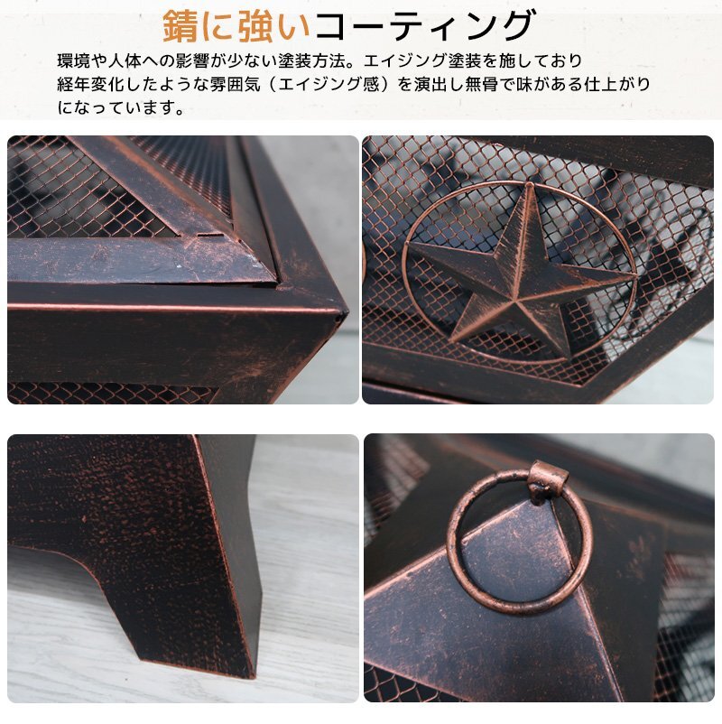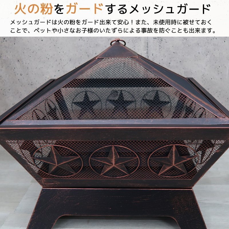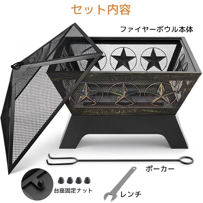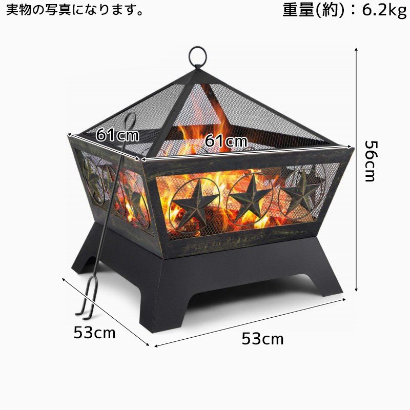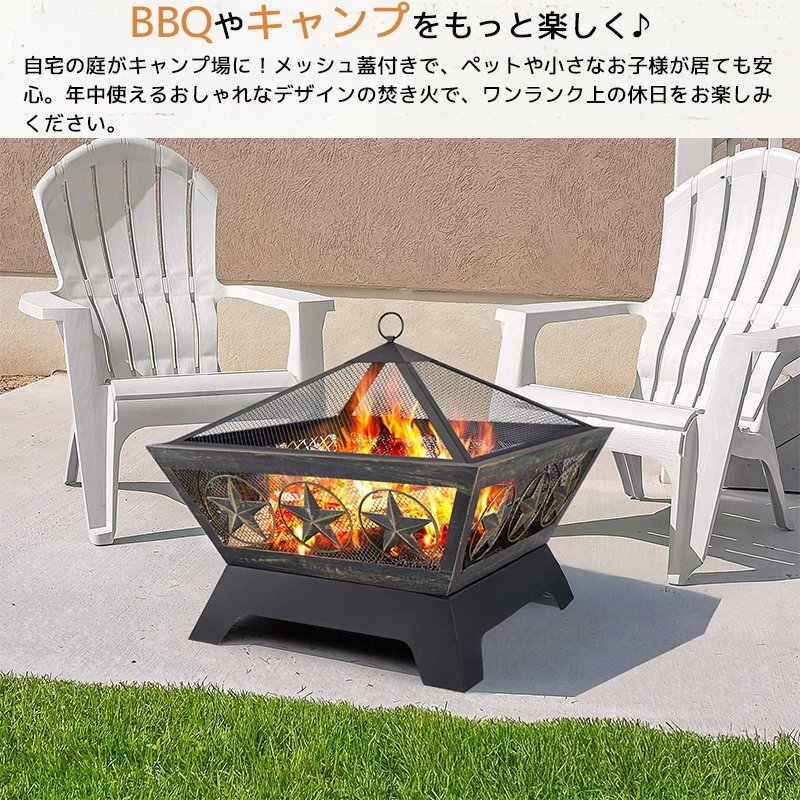 自宅の庭がキャンプ場に!メッシュ蓋付きでペットや小さなお子様が居ても安心。 年中使えるおしゃれなデザインの焚き火で、ワンランク上の休日をお楽しみください。 ■火の粉をガードするメッシュガード メッシュガードは火の粉をガード出来て安心!また、未使用時に被せておく ことで、ペットや小さなお子様のいたずらによる事故を防ぐことも出来ます。 【商品詳細】 サイズ(約):幅61×奥行き61×高さ56cm 重さ(約):6.2kg 材質:鉄 カラー:ブラック セット内容:ファイヤーボウル、メッシュ蓋、格子、ポーカー ※こちらの商品はお客様にて簡単な組み立てが必要になります。 ※英文説明書が付属しております。 |