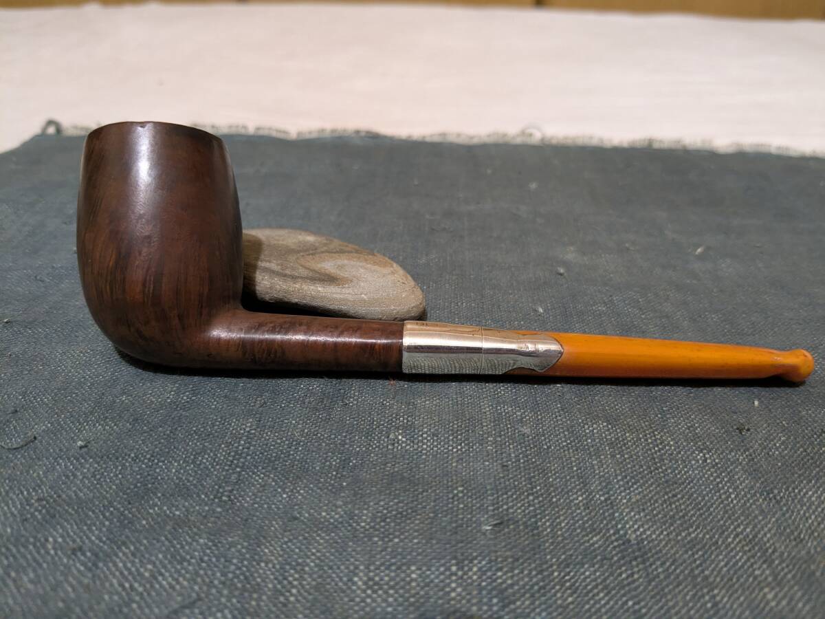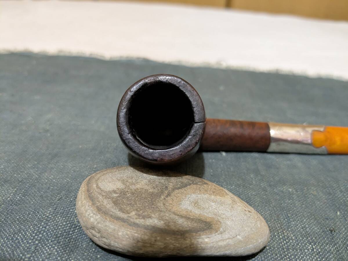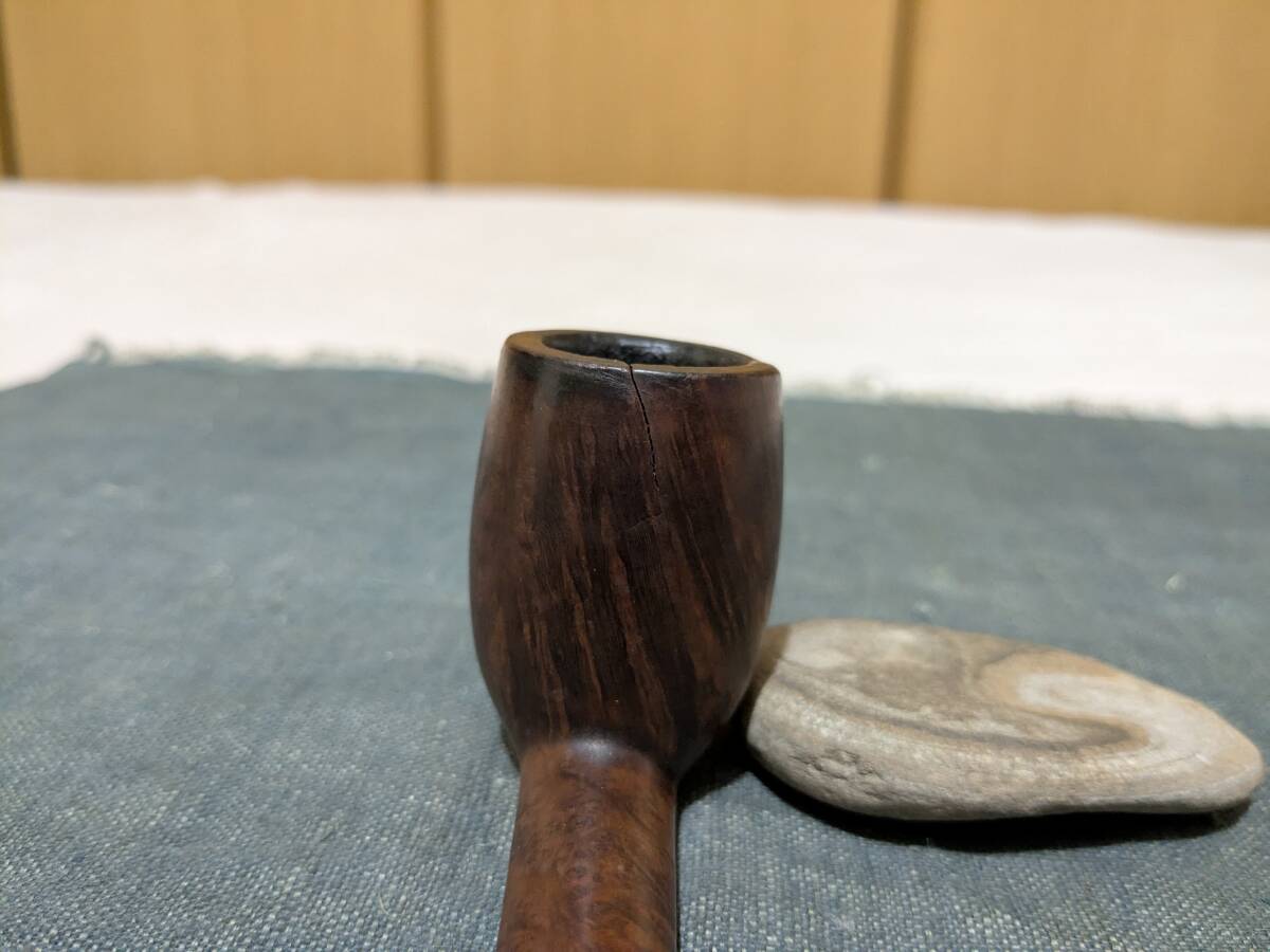 こんな感じでそのうえ、ボウル手前側に派手なクラックがあります(画像参照)。幸い、押しても動かないくらいで堅牢さを保っており、今後破損が進む恐れも少なそうです。実際、喫煙にも何ら問題ありませんでした。さて、肝心の喫味ですがこれが実に旨い。キュアリングではなく生木系ですが、自然な広がりを持ちつつ複雑さと濃密な味わいもあって大満足です。この古い古いカナディアン、きっと樹齢の古い材を使っているのでしょう。このようにアンバーステム側にも銀が使われているパイプは高級仕様なので、この謎のメーカーの高級ラインだったのでしょうね。いつの日か素性がわかればいいと思いつつ、断舎離いたします。コアなパイプ・マニアの方、或いはひたすら旨いパイプを求める方、どうぞ。