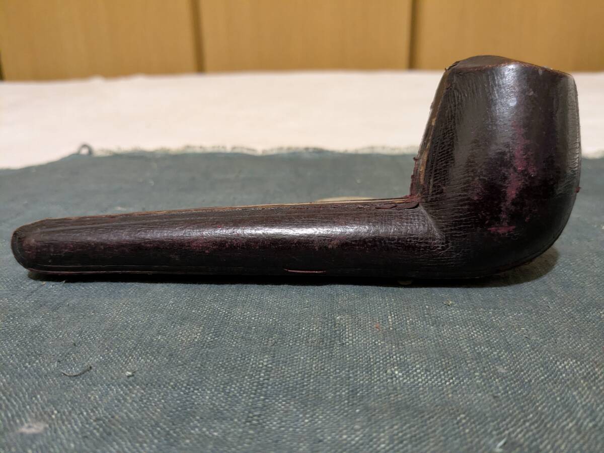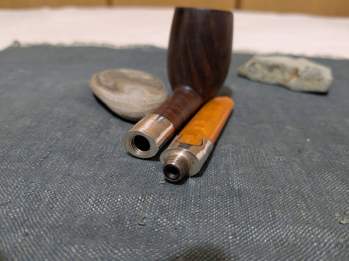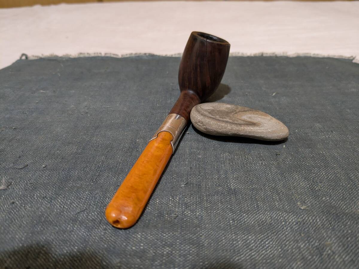 こんな感じでそのうえ、ボウル手前側に派手なクラックがあります(画像参照)。幸い、押しても動かないくらいで堅牢さを保っており、今後破損が進む恐れも少なそうです。実際、喫煙にも何ら問題ありませんでした。さて、肝心の喫味ですがこれが実に旨い。キュアリングではなく生木系ですが、自然な広がりを持ちつつ複雑さと濃密な味わいもあって大満足です。この古い古いカナディアン、きっと樹齢の古い材を使っているのでしょう。このようにアンバーステム側にも銀が使われているパイプは高級仕様なので、この謎のメーカーの高級ラインだったのでしょうね。いつの日か素性がわかればいいと思いつつ、断舎離いたします。コアなパイプ・マニアの方、或いはひたすら旨いパイプを求める方、どうぞ。
