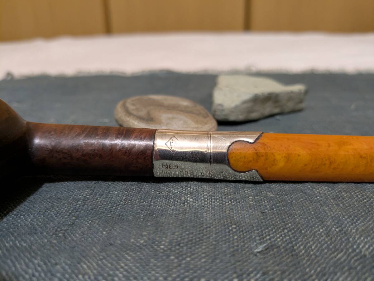 これに関しては刻印が摩耗しており、一部からでは判断不可能でした。アンバー・ステムの銀細工の感じから1890年代のものと思われます。見える刻印は◇のなかに「&、D,P(or F or H?),C(Coと思われる)」とあり、バーミンガムのホールマークは見えますがアルファベットはわからず。おそらくは19世紀末に無数にあった英国のパイプメーカーの一つだと思われます。