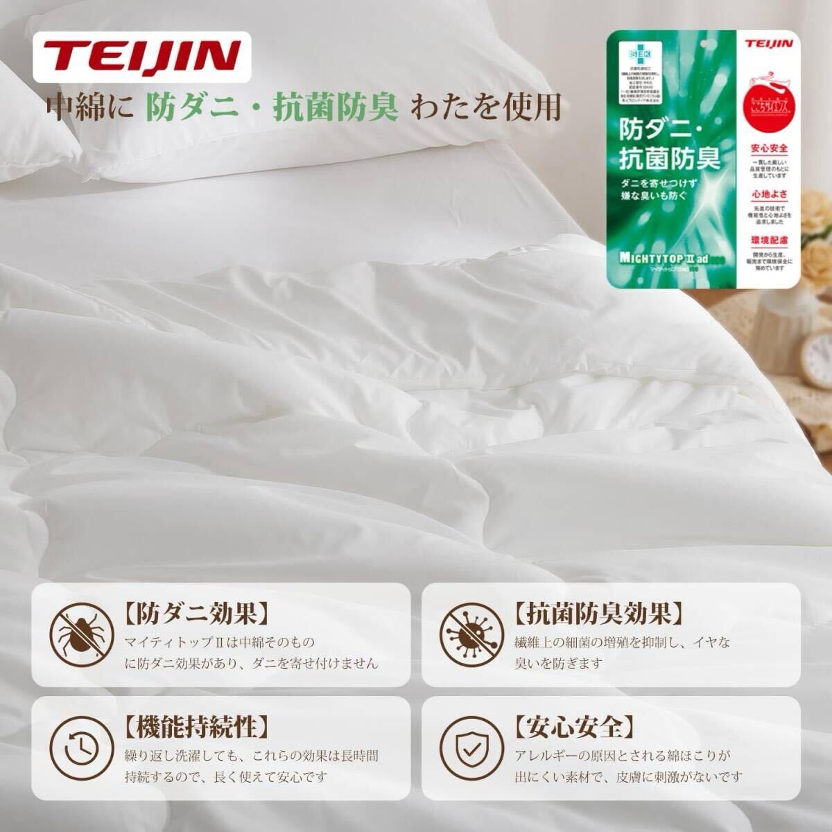 防ダニ・抗菌・防臭機能の中わたを50%配合しております。日々のご使用でも清潔感を保ちやすくなっております。