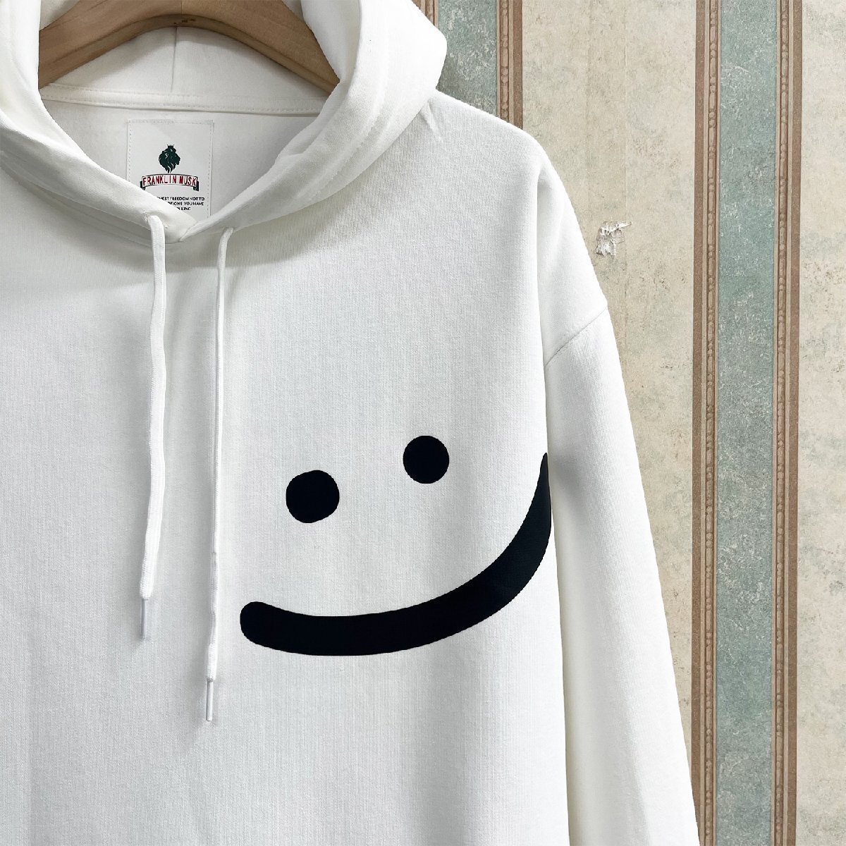 カラーは何かと出番の多いブラック、トレンドに左右されないベーシックカラーだからこそ、飽きることなく長く愛用できる。全体的には個性的な笑顔などのプリントをセンス良く落とし込んで、色や柄等細部へのこだわりも見逃せないポイント!さっと一枚着るだけでお洒落をぐっと格上げしてくれる。フロントにレイアウトされた大きなカンガルーポケットが特徴、収納力が高く、手のやり場にも困らないので、アウターの中に仕込めば、バッグのようなテンションでお使い頂ける。また、裾部分と袖口のリブ仕様で、タフな着用でも型崩れしにくい仕上がりになっている。