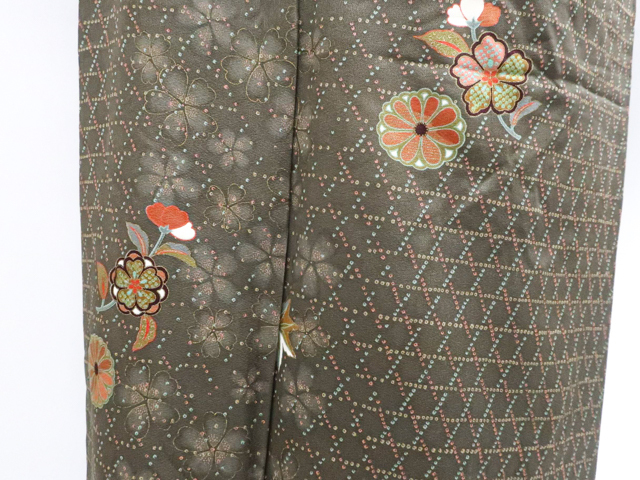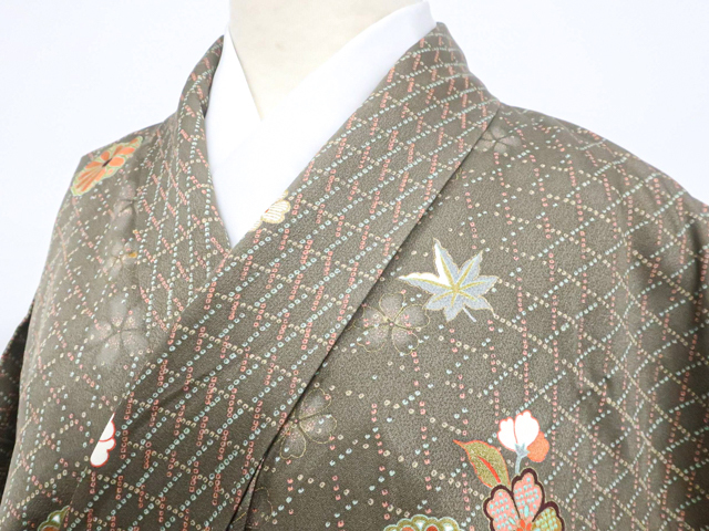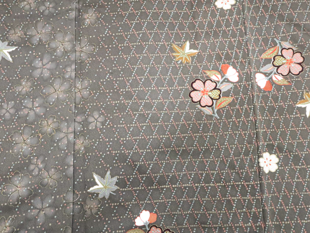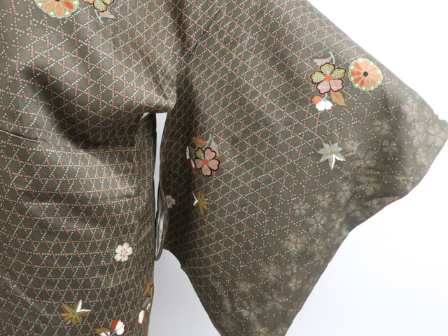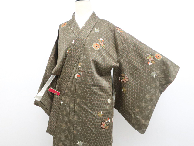 《京都一輝堂》小紋 籠目に紅葉と花 正絹 着物 身丈約160cm 裄丈約66cm 25z11-6267
