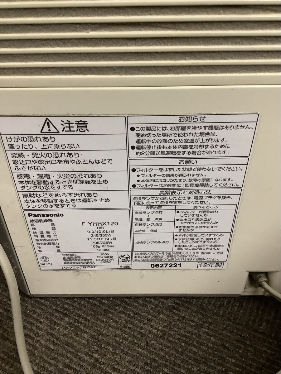 11D02 Panasonic パナソニック 除湿乾燥機 F-YHHX120 通電確認済み