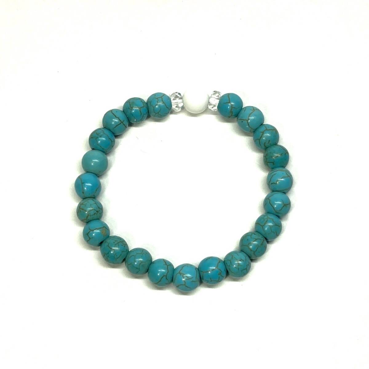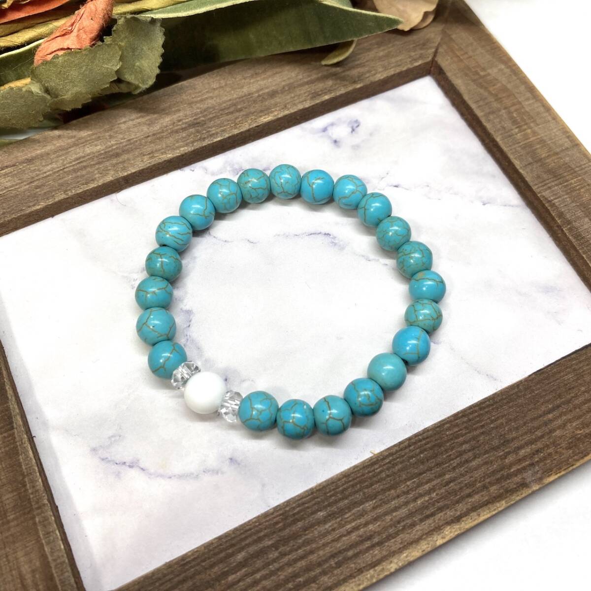 こちらは、ホワイトオニキスとターコイズを組み合わせた一粒ブレスレットです。石大きさ8mm玉で基本サイズは内周15cmです。プレゼントしてもいいと思います。