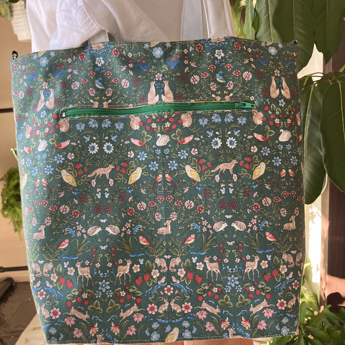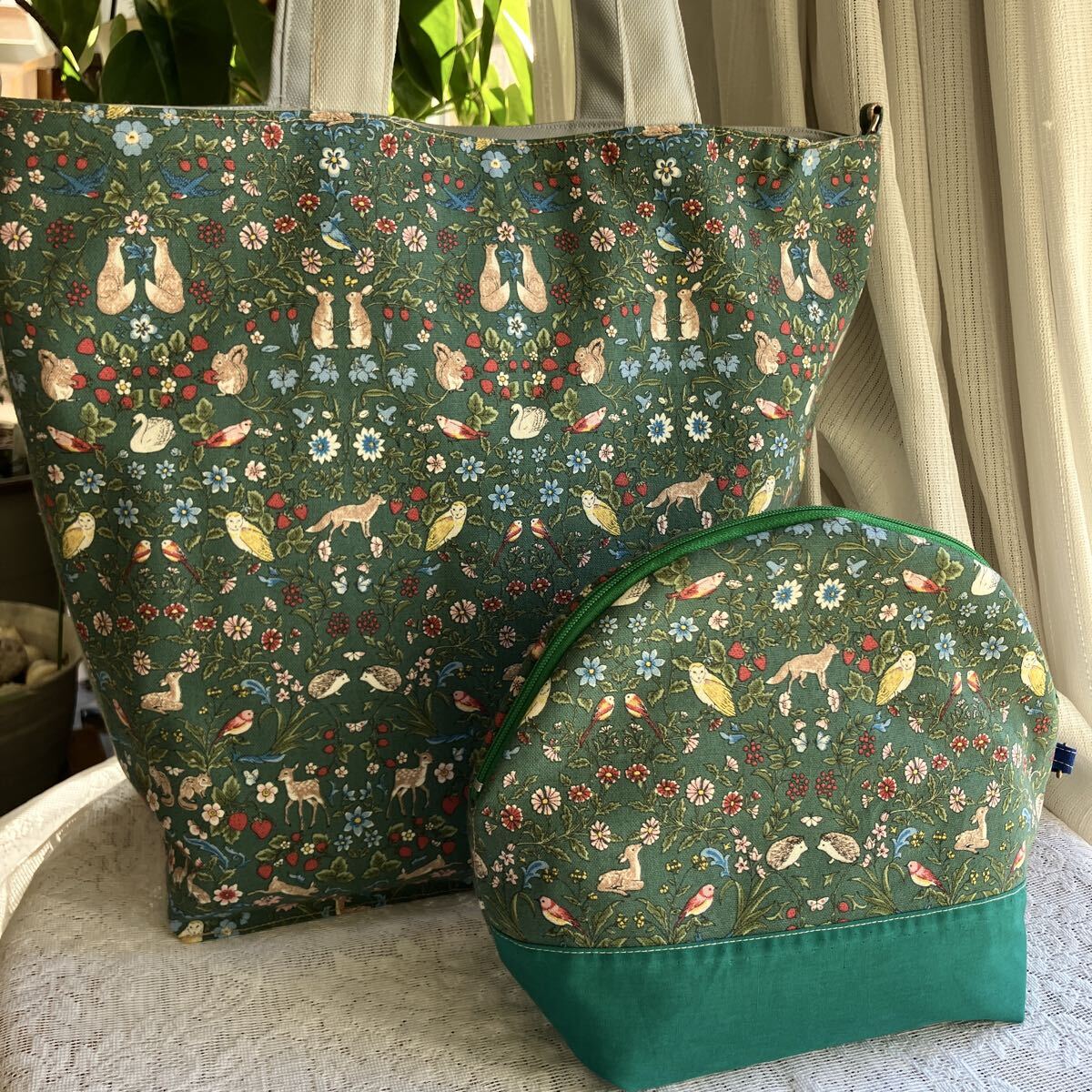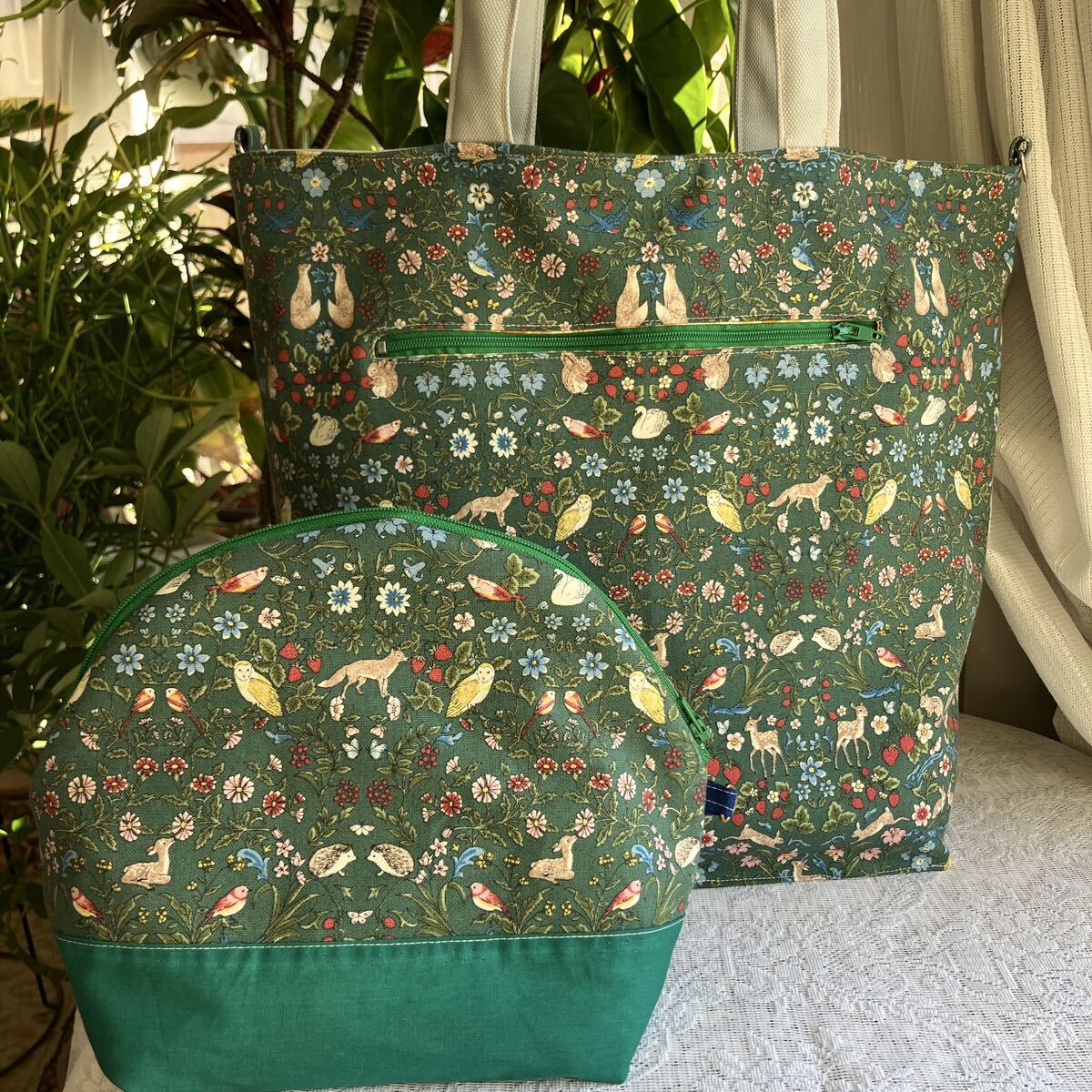 ハンドメイド☆小さな動物と植物 優しい柄 グリーン 使いやすいトートとふんわりポーチ 20㎝のファスナーポケットも便利