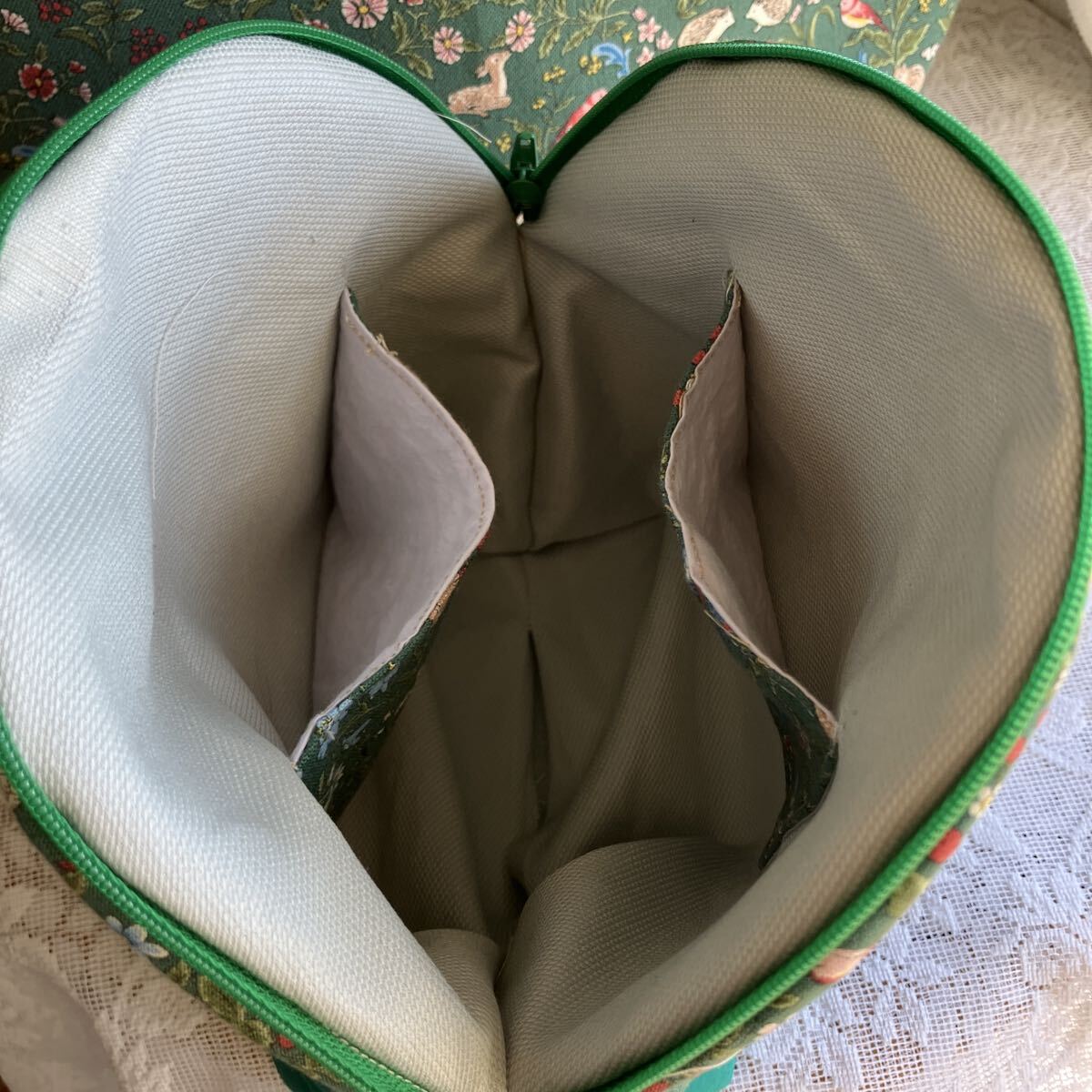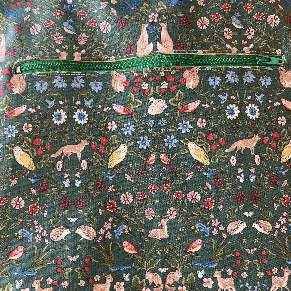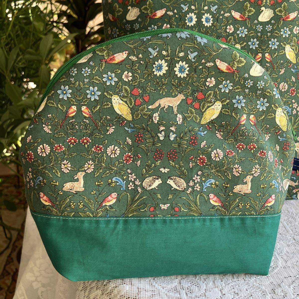 ハンドメイド☆小さな動物と植物 優しい柄 グリーン 使いやすいトートとふんわりポーチ 20㎝のファスナーポケットも便利