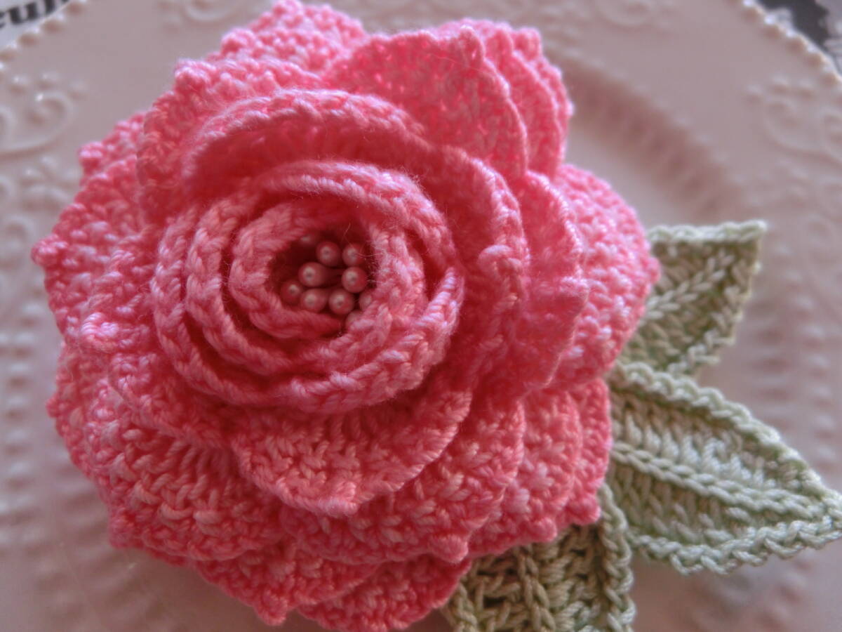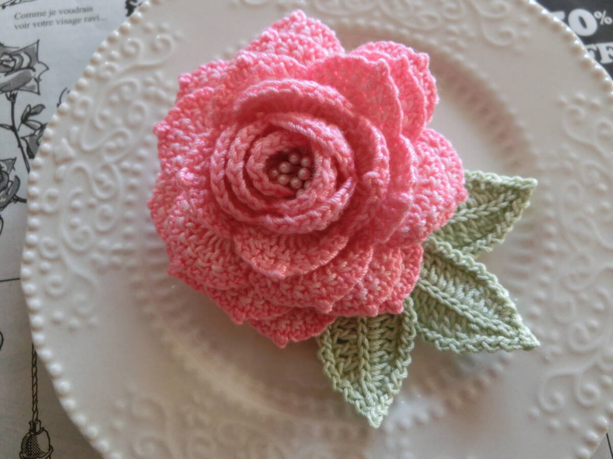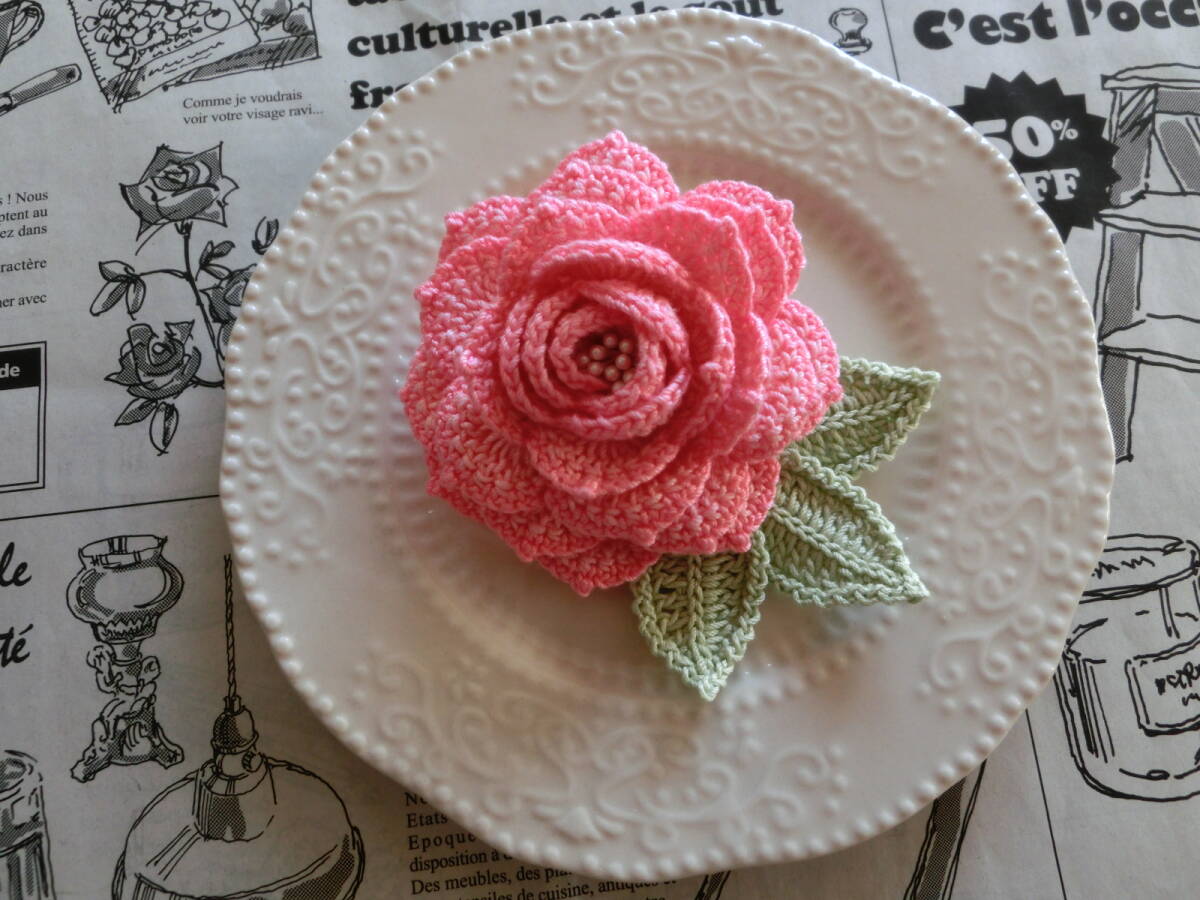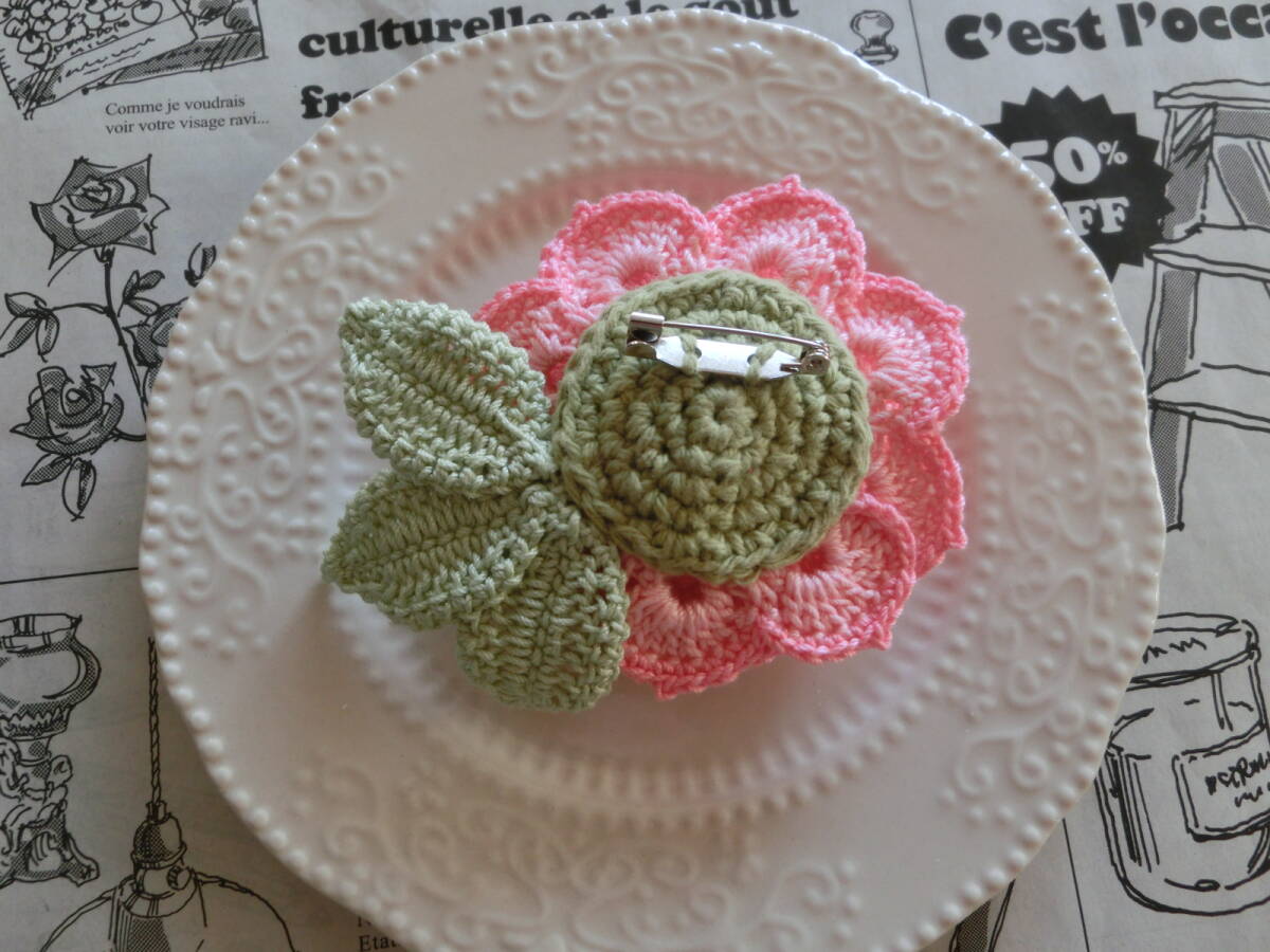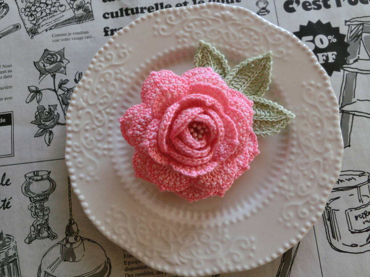 ☆ 2497  一輪薔薇のコサージュ  とんがり花弁  ピンク色系薔薇  クロシェレース  ハンドメイド