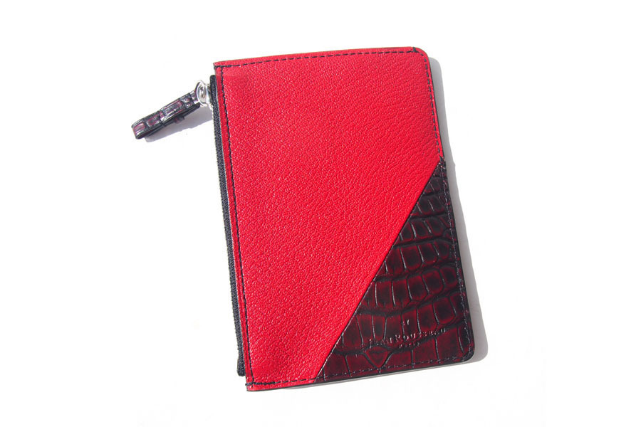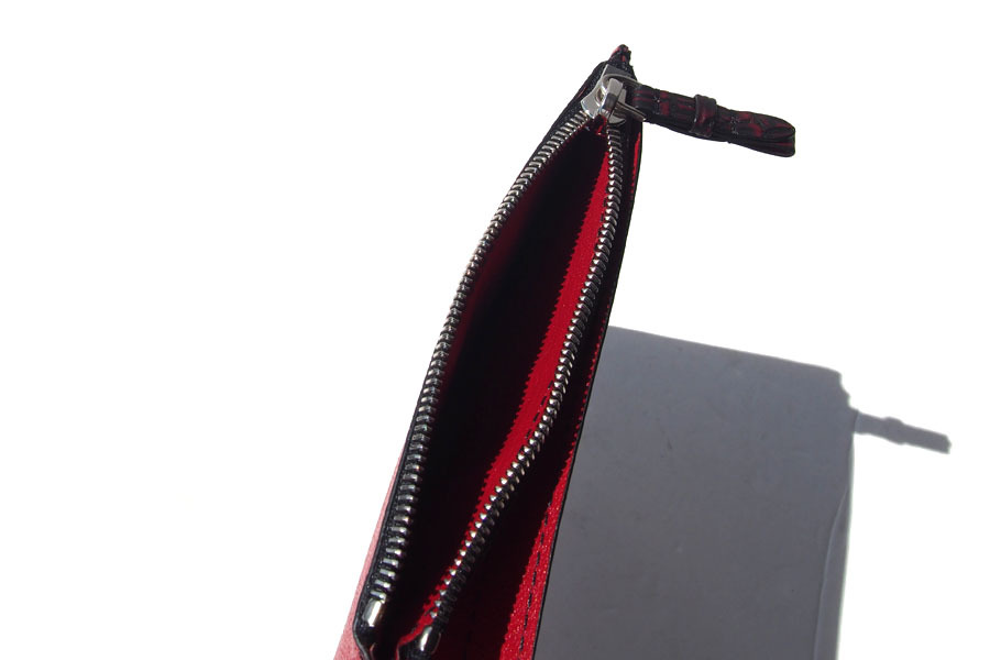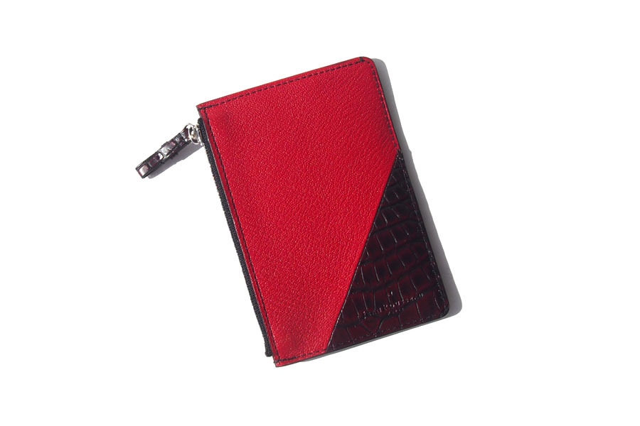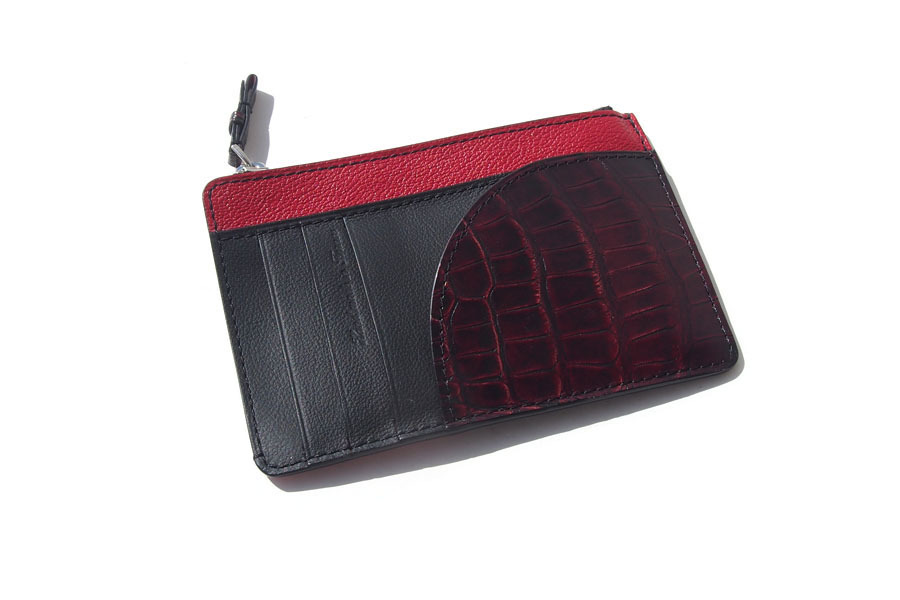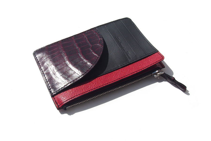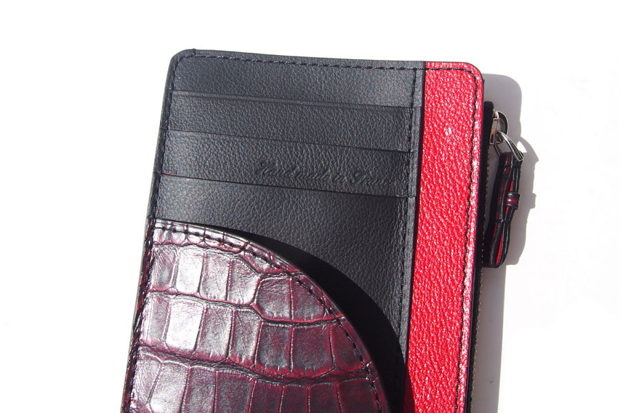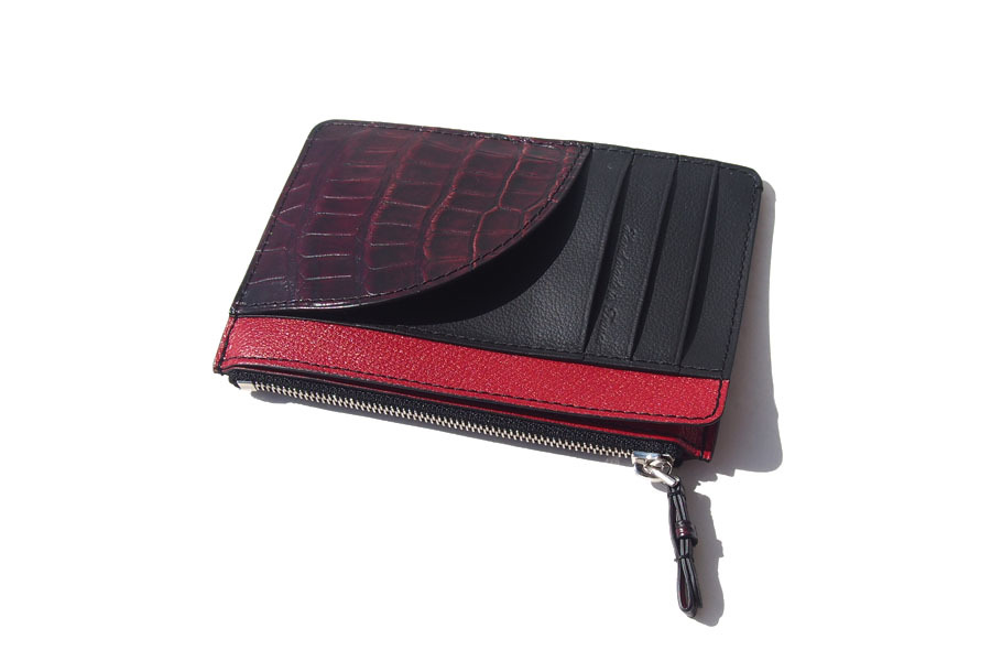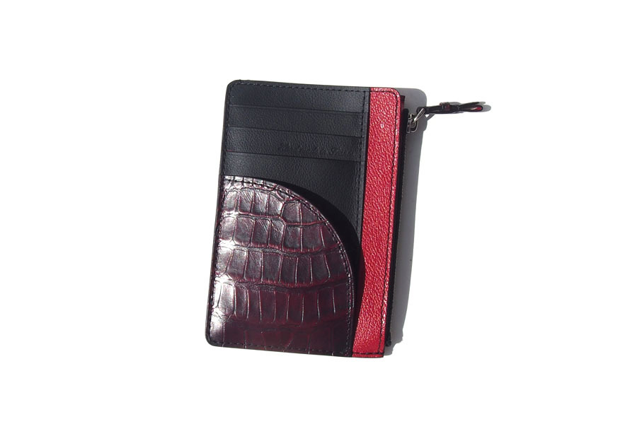 きめ細かで、上質な素材3種(グレインレザー・アリゲーター・ゴートレザー)をブラックとレッドで配色し、キリッとしたルックスのフラグメントケースです。
