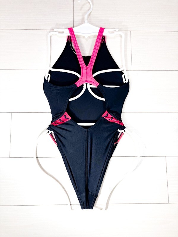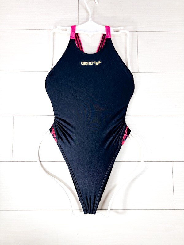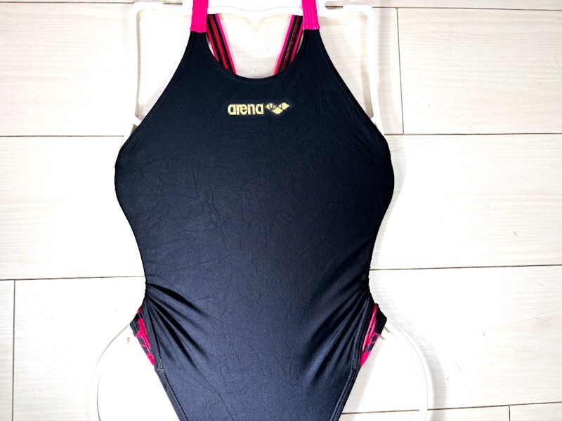 27アリーナ女子競泳水着M★ストラッシュ/ARN-1663W★薄地★光沢黒ブラックピンクサイドロゴ柄★オープンバックハイレグ