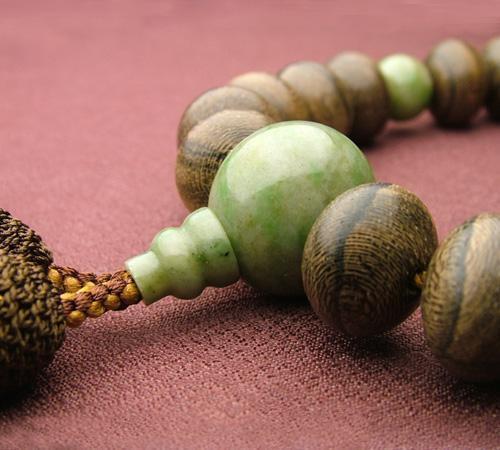 ■主珠と二天珠には独山珠を、正絹房にはこげ茶金の房を使用していますので、全体的に大地を思わせる様な優しい色合いになっています。一生ものの念珠としてお持ち頂けます。