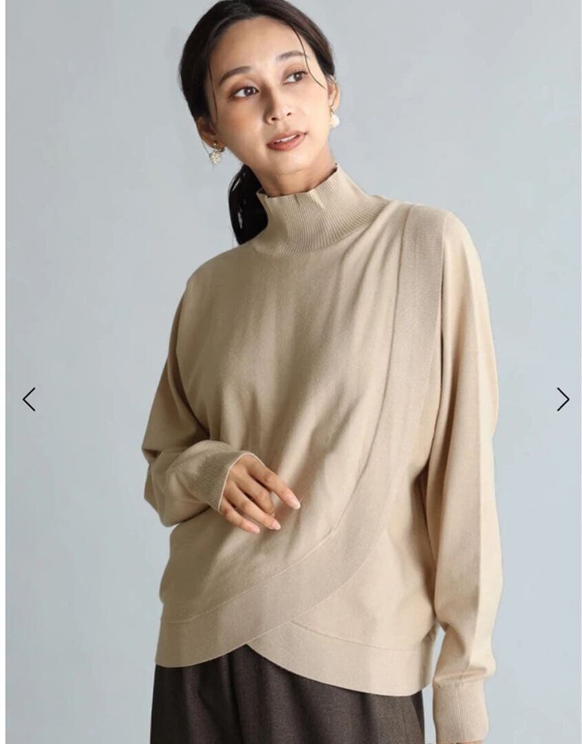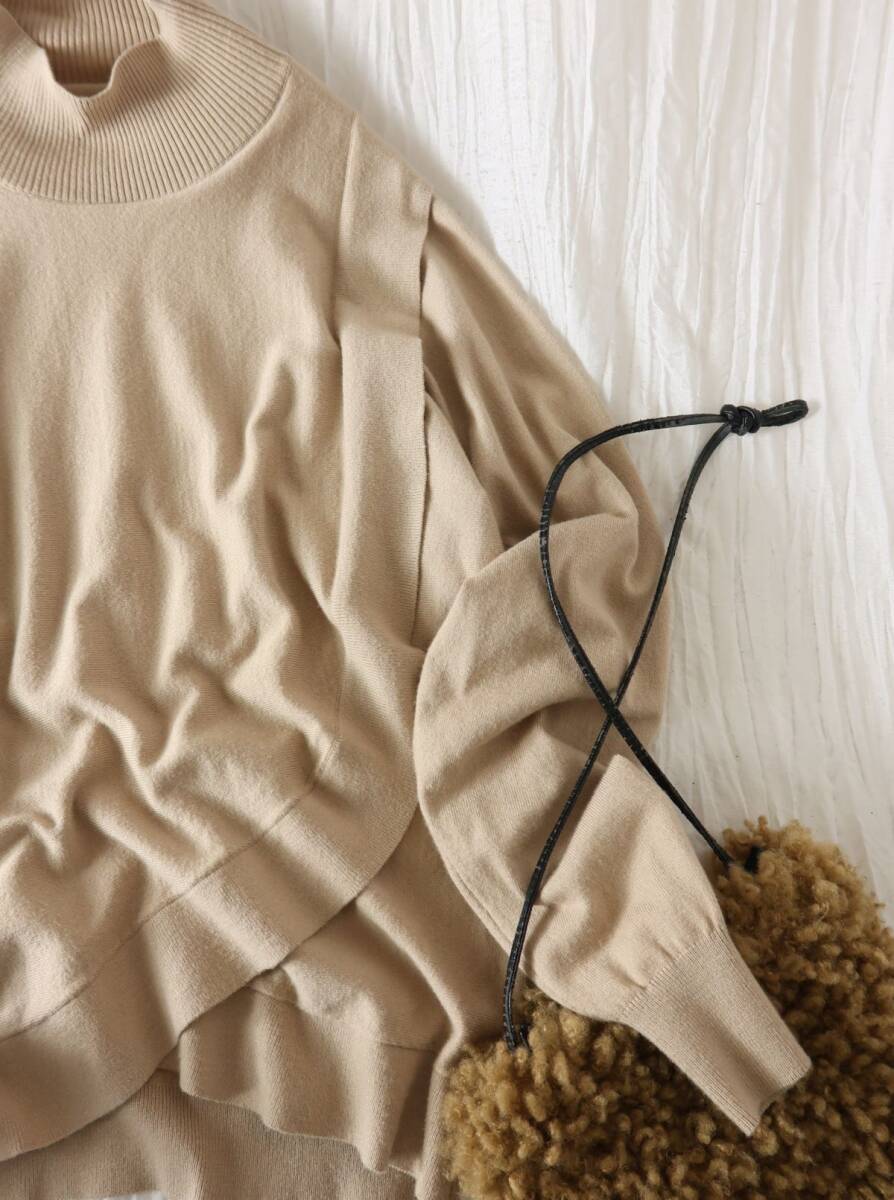 シンプルなハイネックニットにフロントのクロスデザインがアクセントになったハイゲージニット。