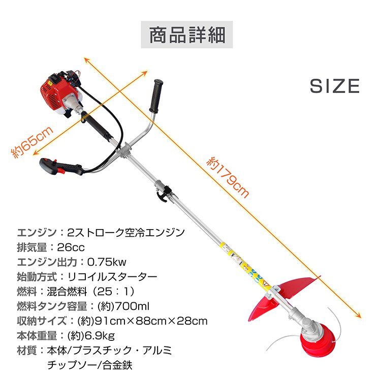 草刈機 刈払機 刃 エンジン 26cc 芝刈り機 2サイクル 2分割式 チップソー ナイロンコードカッター diy 伐採 草刈り 剪定 除草 ny421