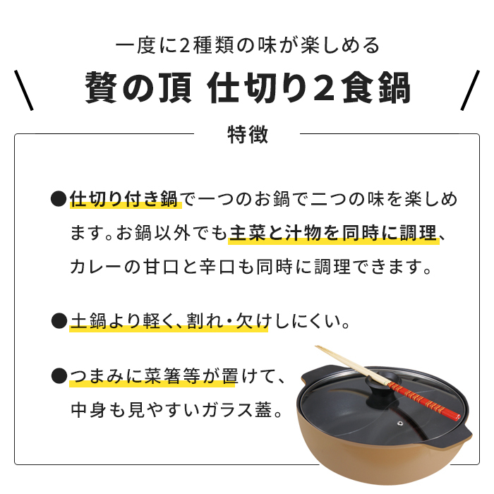 | 一度に2種類の味が楽しめる仕切り鍋。 お鍋以外でも主菜と汁物を同時に調理、カレーの甘口と辛口も同時に調理できます。 土鍋より軽く、割れ・欠けしにくい。 つまみに菜箸等が置けて、中身も見やすいガラス蓋。 内面は汚れがこびりつきにくいふっ素塗膜加工。 |