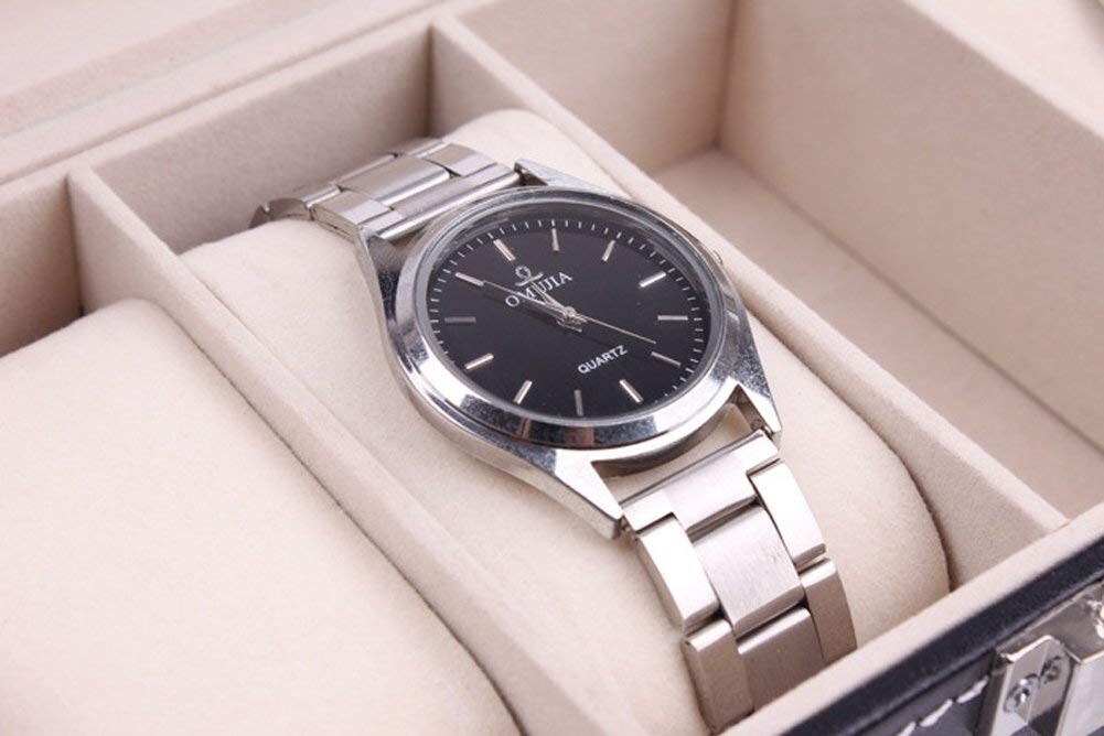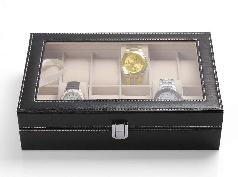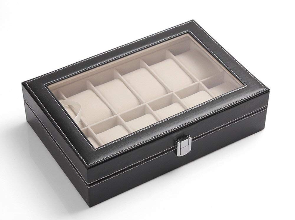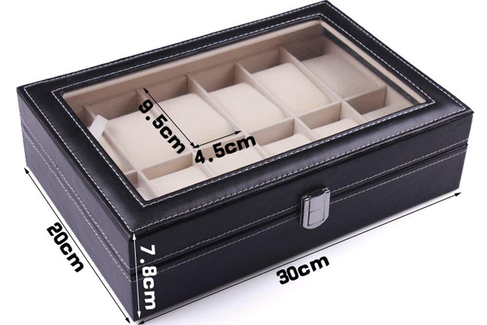 重厚感を感じさせる高級ウォッチケースです 時計12本分が収納できる十分な収納力です。 愛用のコレクションを大切に収納するウォッチケース。 天板がガラス張りになっているので、ディスプレイ感覚で収納できる。 表面はPU皮革なので、汚れても落としやすくお手入れも簡単。 本体/横幅30cm×奥行20cm×高さ8cm、クッション/横幅4.5cm×奥行8cm×高さ3cm