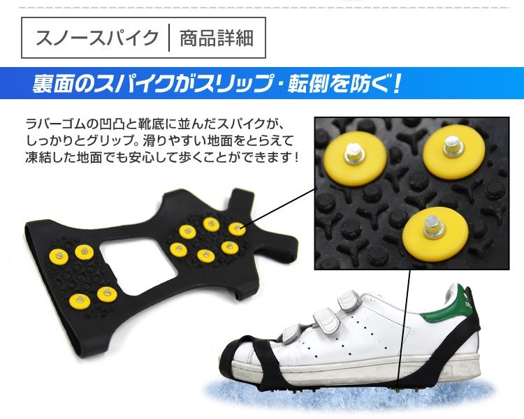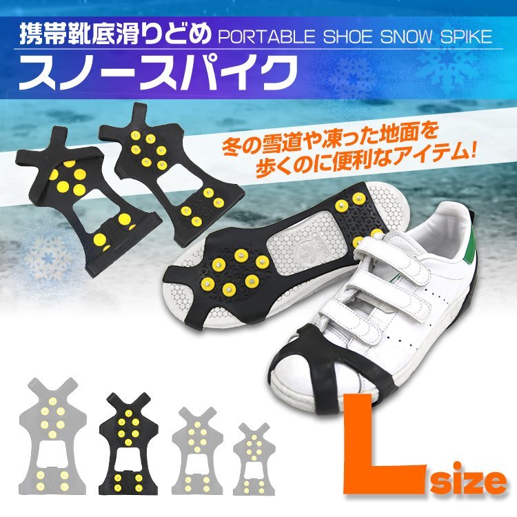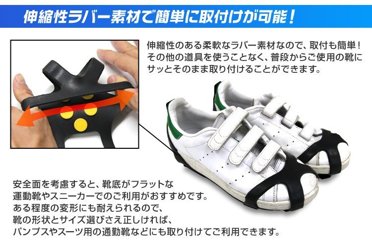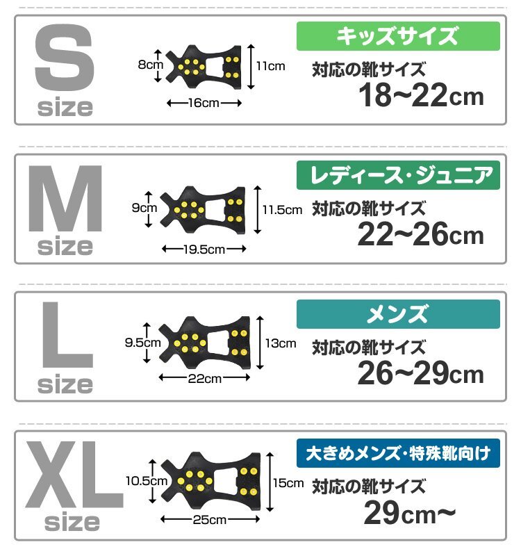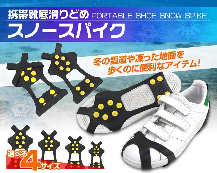 | スパイクとラバーゴムの溝とのダブル効果で強力に冬道をサポート! すべり止めスパイクです。 10本のスパイクでしっかりグリップしてくれるので、安心して歩けます。 急な積雪にも安心! スニーカーやビジネスシューズに、取付けカンタン! いつも履いているシューズに装着するだけ。 冬はぜひ急な積雪の備えに持ち歩く事オススメです。 【商品仕様】 サイズ: ・L(26cm〜29cm) 素材:ゴム、鉄 ▼サイズ別販売ページはこちら▼ ■ Sサイズ(18cm〜22cm) ■ Mサイズ(22cm〜26cm) ■ Lサイズ(26cm〜29cm) ■ XLサイズ(29cm〜) 【注意事項】 ・雪道や凍結路面以外でのご使用はおやめ下さい。 ・靴の形状や素材によって使用できないものもありますので、ご了承下さい。 ・事故の原因となりますので、着用前には必ず亀裂、破損等がないことをご確認下さい。 ・スパイク部が磨り減ったり脱落した場合は使用しないで下さい。 ・スパイク部は鋭利なので、脱着の際は怪我等しないようにご注意下さい。 ・雪道での歩行時に滑りにくくするもので、安全を保証するものではありません。万一、転倒によりケガをされても、当社及び販売店は一切責任を負いかねます。 ・商品は、モニターによって色合いが異なって見える場合があります。 ・仕様・デザインは改良のため予告なく変更することがあります。 |