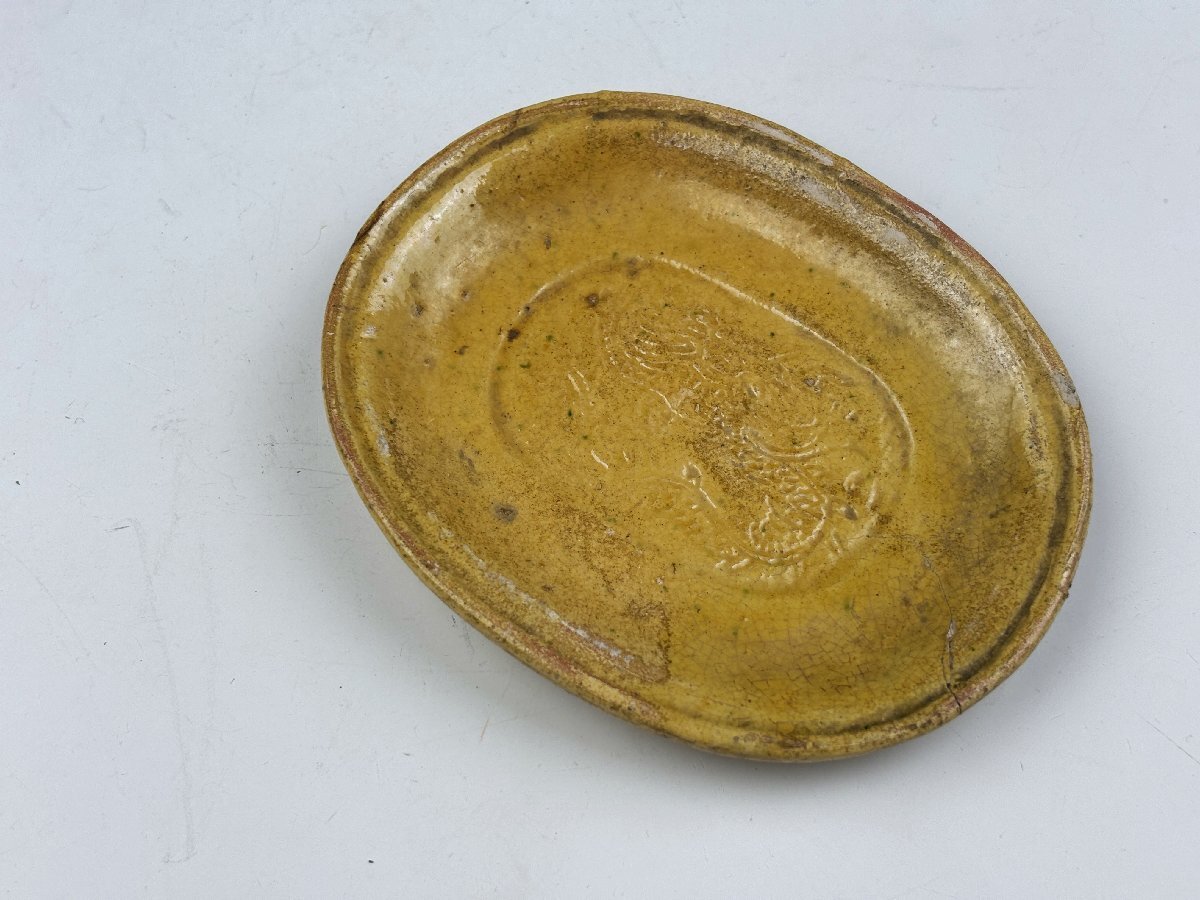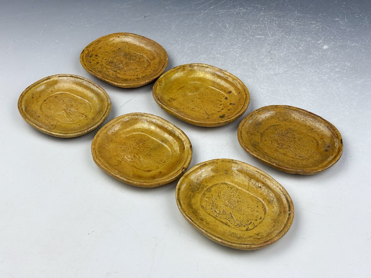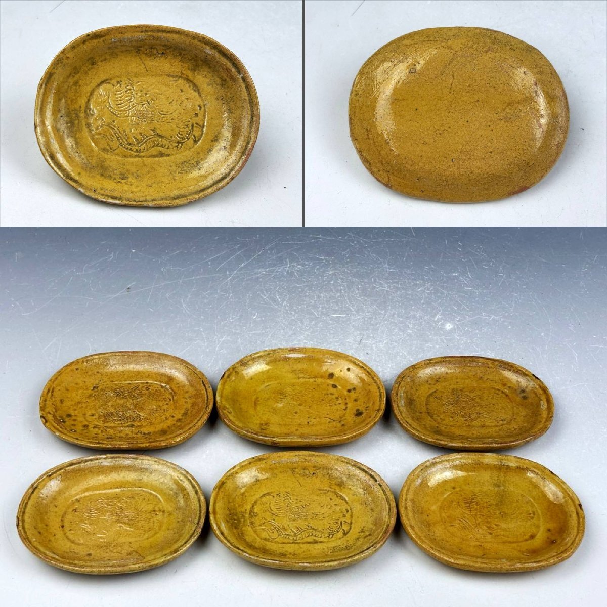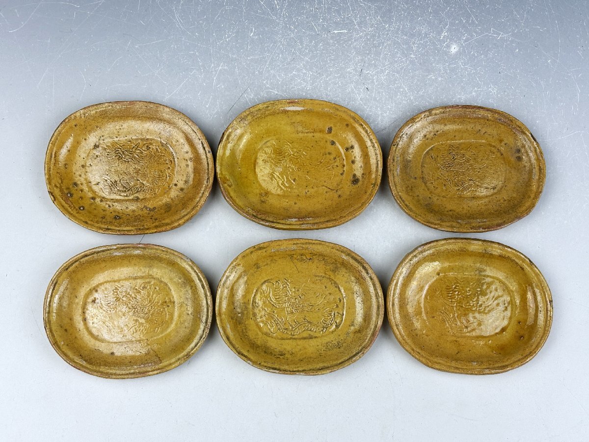 時代物 珉平焼 淡路焼 黄交趾 龍文刻 小判形 小皿 豆皿 楕円皿 銘々皿 取皿 6客 懐石 和食器 茶道具 江戸後期 古陶磁器 古美術骨董品 FRS214