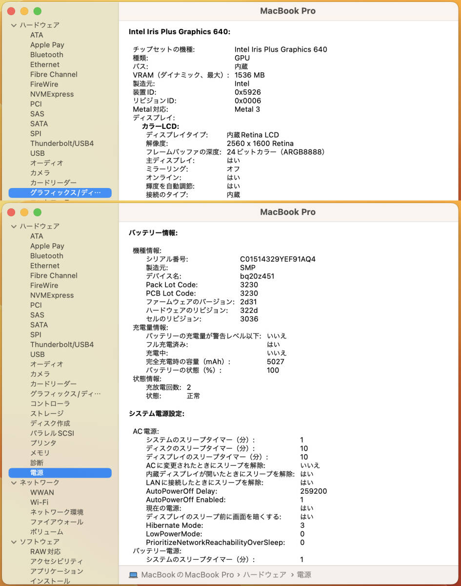 バッテリー交換済み!) MacBook Pro14,1 (13-inch, 2017, Two Thunderbolt 3 ports), A1708 (MPXT2J/A),  2.3GHz デュアルコア Intel Core i5(Turbo Boost使用時最大3.6GHz), 8GB-RAM, 256B-SSD, バッテリー新品(TONTEK 製), JIS キーボード, スペースグレイの出品です(Retina ディスプレイモデル2,560 x 1,600ピクセルです)。