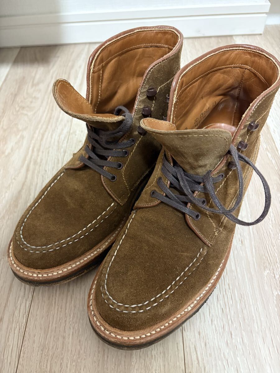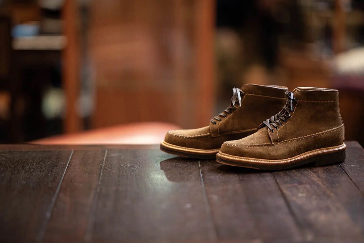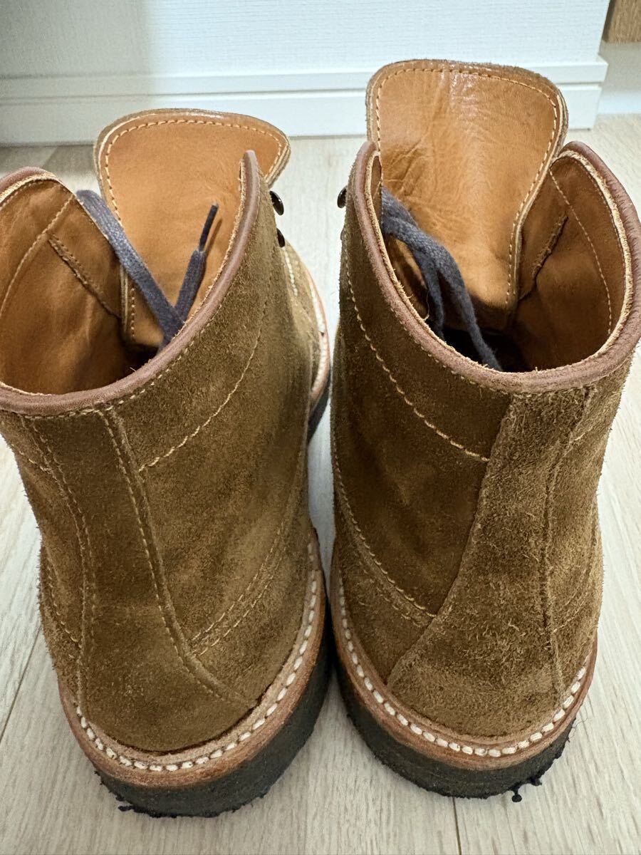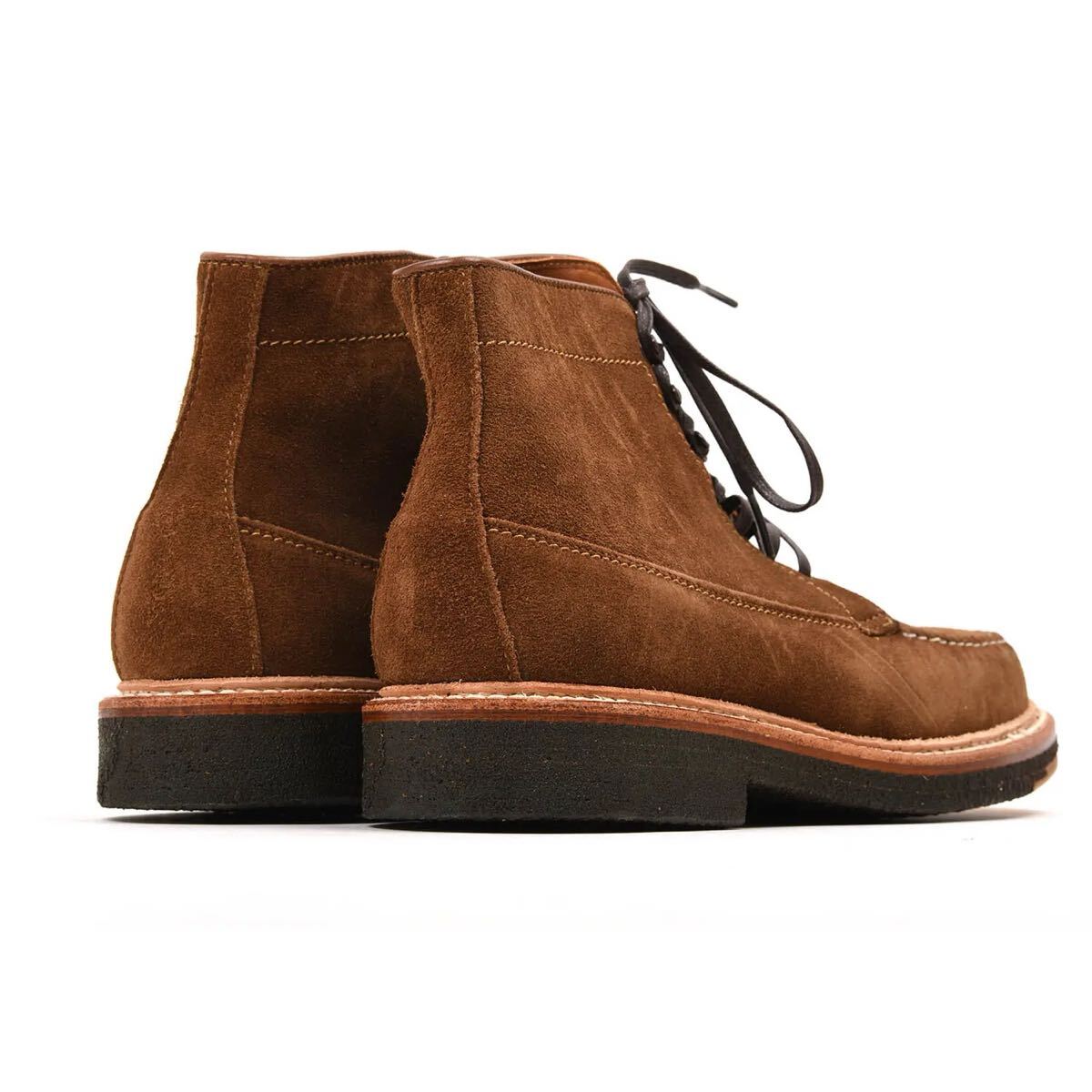 プランテーションクレープソールによる柔らかくコンフォータブルで危なげないフィーリング。グリップ感は申し分なく、爪先だけに装着されるレザーのトゥチップ部分だけがカチっとした感触を得られる独特のソールもこの靴の魅力です。アッパーのスウェードSNUFFに好マッチングのデザインで、アメリカンカジュアルな装いに彩りを添えてくれるでしょう。