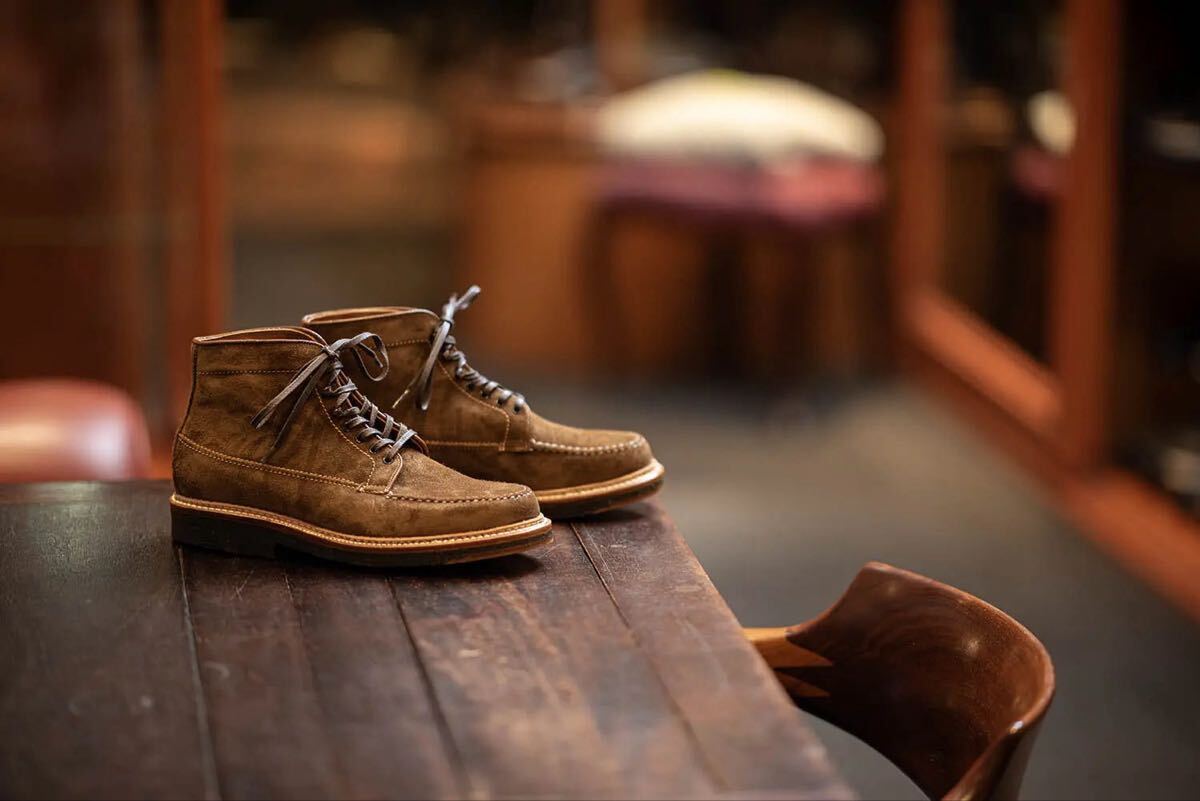 隠れた名作RANGER MOCCをブーツに改良したMICHIGAN BOOT。モカシンとサイドのステッチを際立たせる為、通常のブーツに使われる9アイレットから7アイレット(4アイレット+3フック)に減らしたミシガンブーツだけの特別仕様です。つま先のモカシンとウエルトのグッドイヤーステッチがリンクして、上品な表情に。