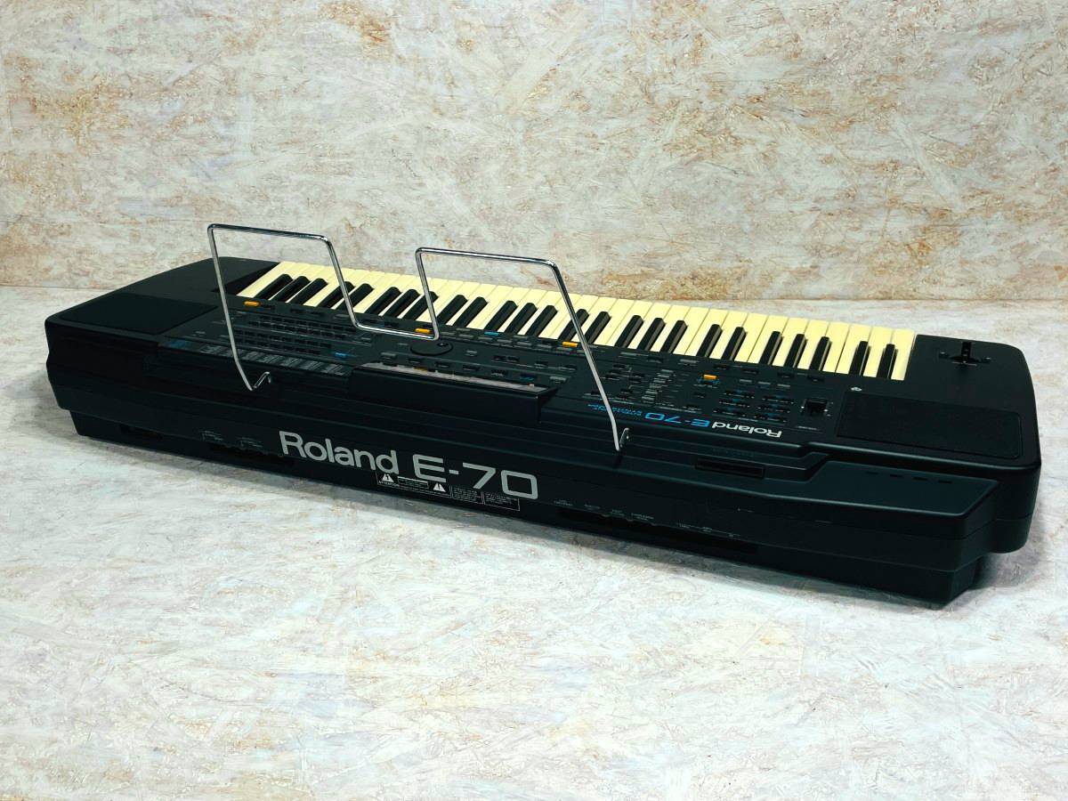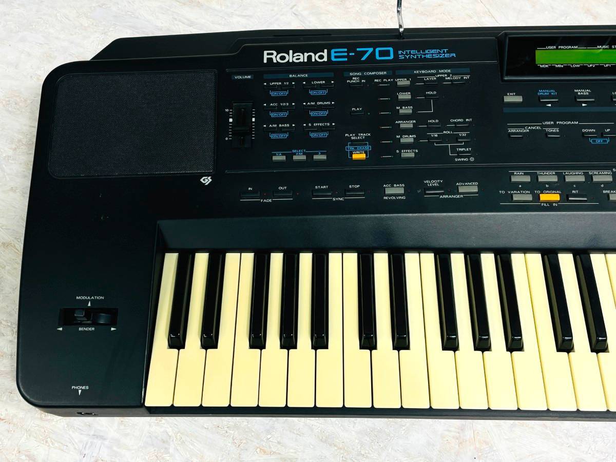 インテリジェント シンセサイザーE-70です。アレンジャー機能により様々なジャンルのリズム・コードバッキング、効果音等で曲を演奏・作成可能。スピーカー、MIDIを搭載。重量は14、4 Kg。1991年発売。