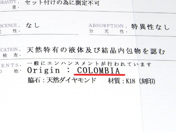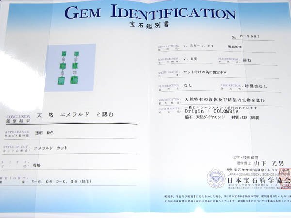 ●コロンビア産 ●両耳 総計6.06ct 【片方にct数の刻印あり】 ◆天然ダイヤモンド ●両耳 総計0.36ct 【片方にct数の刻印あり】 ◆付属品【日本宝石科学協会】発行 産地特定宝石鑑別書】 |