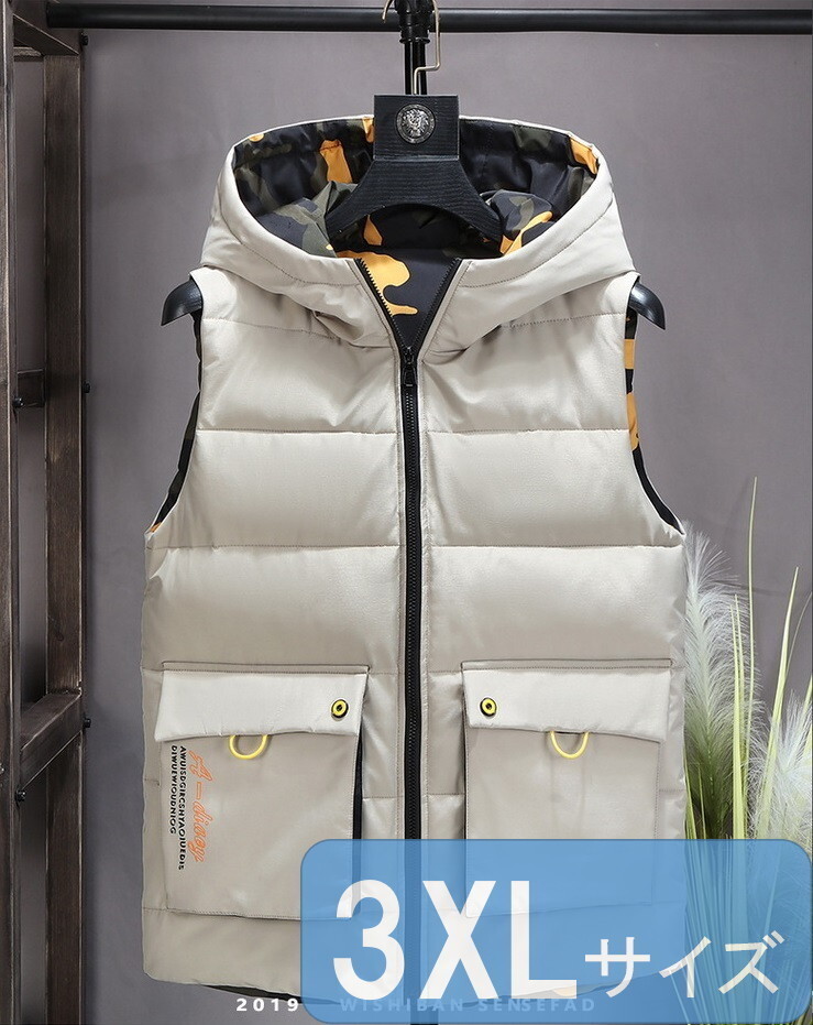 リバーシブル メンズ ダウンベスト 998 ベージュ 3XLサイズ 中綿ダウン 中綿ベスト キルティング アウター 防寒 秋冬 暖かい
