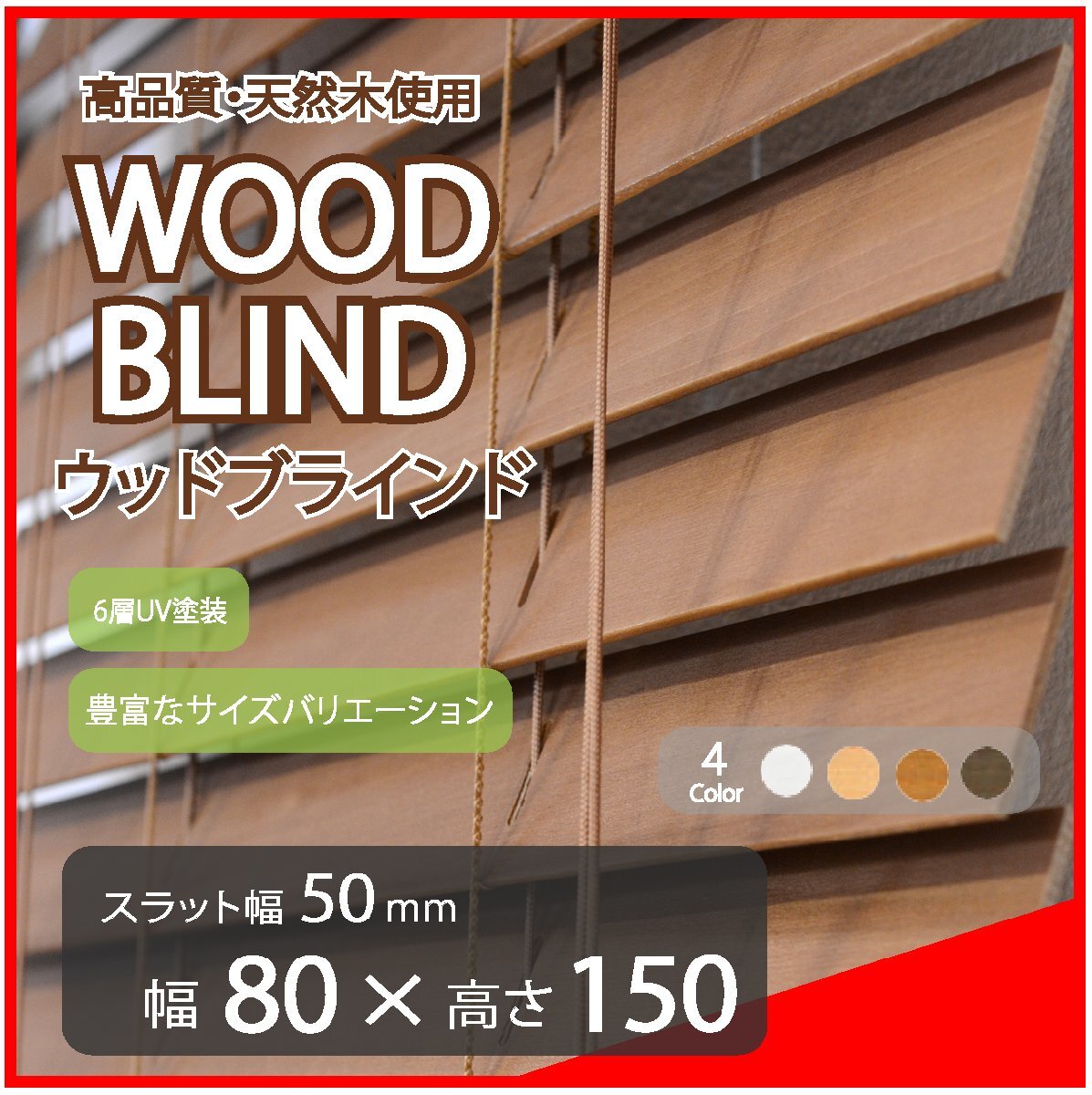 ● 6層UV塗装の高級スラット(羽根) ※1枚無垢のバスウッドスラットに高級家具並みの6層コートを採用しています ● スラット幅(羽根)2種類×68種類のサイズバリエーション×4カラーを取扱いしております ※上記により商品アイテム点数が多い為、常に全てを出品しておりませんので お探しのサイズがございましたら下記の表をご覧頂き、ご質問欄よりお気軽に在庫お問合せ下さい ● 全国一律 1,200 円 ※ 沖縄・離島等で中継料金が発生する場合、別途お見積りとさせて頂きます ● 安心できる1年間の製品保証・サポート付き ※お買求め頂いた商品は、お買上げ日から1年以内に通常範囲内での製品の不具合等に関しまして、 無償にて修理、交換をさせて頂く保証期間を設けさせて頂いております 但し、使用して消耗するスラット・コード類の経年変化による変色や変形等については保証対象外 とさせて頂いております。また使用状況によっては有償となる場合もございます |