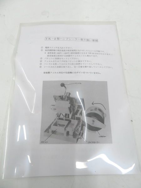 ◆東光機械 2022年◆手動包装機(ハンドシーラー)TK-2型 100V ジャンク出品 340×320×400 サイズ:W340×D320×H400mm 電 源:100V 能 力:約300ヶ/時 用 途: 豆腐、玉子豆腐、漬物、みそ、ところてん、その他 備 考:部品が欠品している為、ジャンク出品とさせて頂きます。 ご参考メーカーホームページはこちらです。よろしければご覧下さい! 出品にあたりクリーニング済みです。 多少の傷・使用感等がありますので、予めご了承ください。 中古品ですので、画像をよくご確認の上、ご理解頂ける方のご入札をお願いいたします。 神経質な方はご入札をご遠慮ください。 気持ちの良いお取り引きにしたいと思いますので、ご不明な点等ございましたらお気軽にご質問ください。 | |