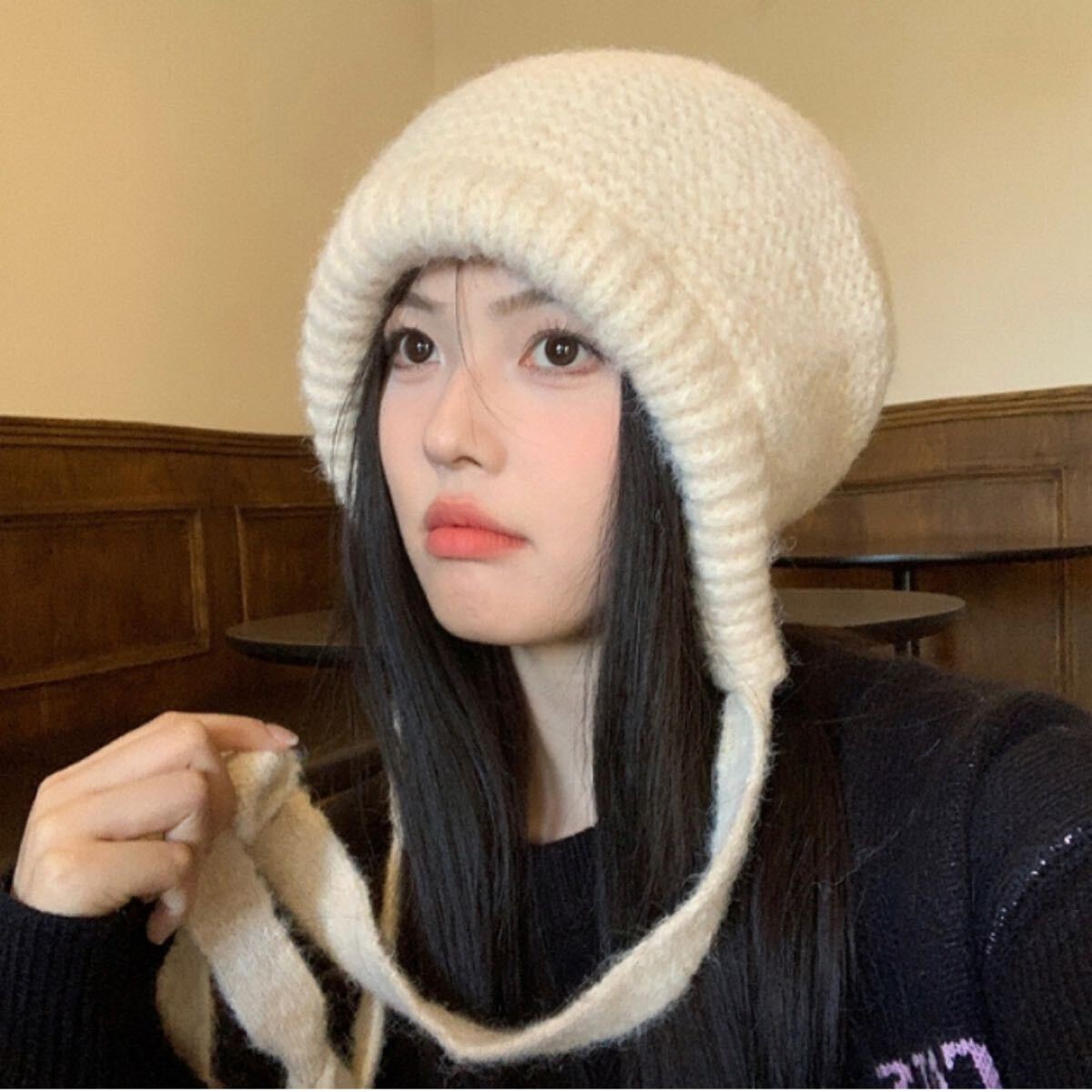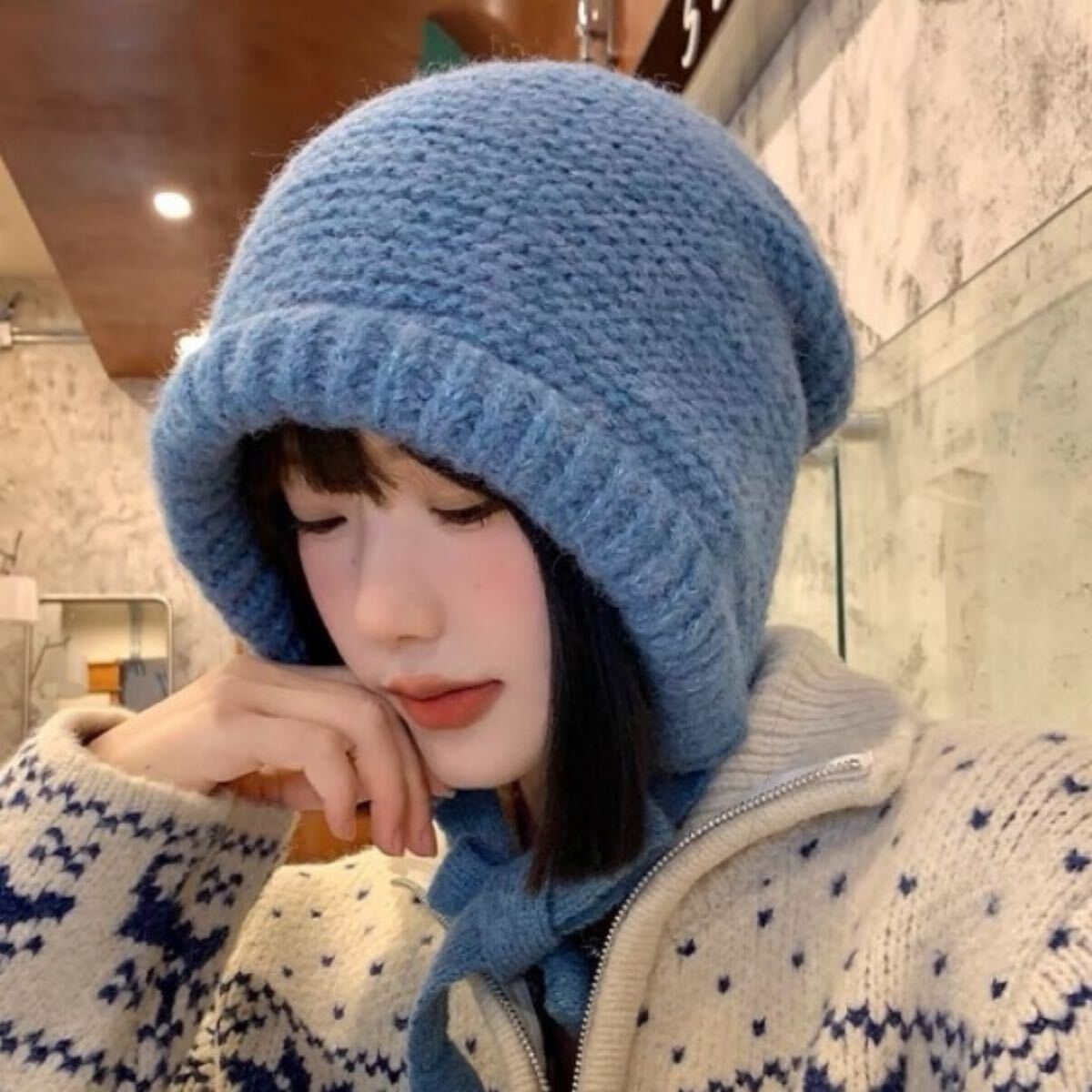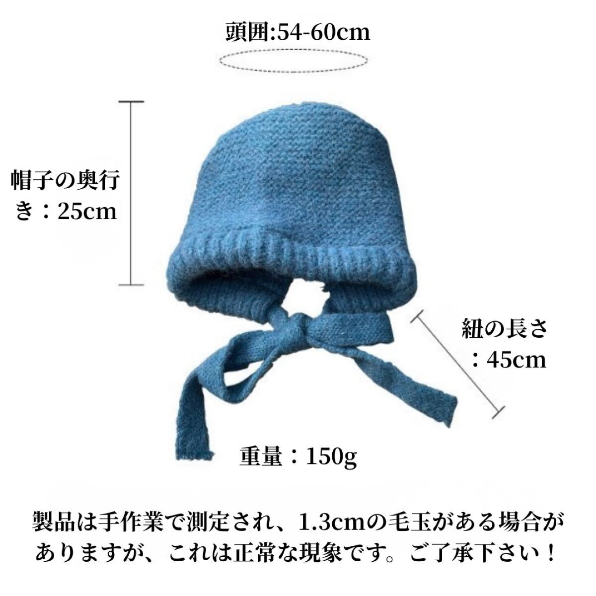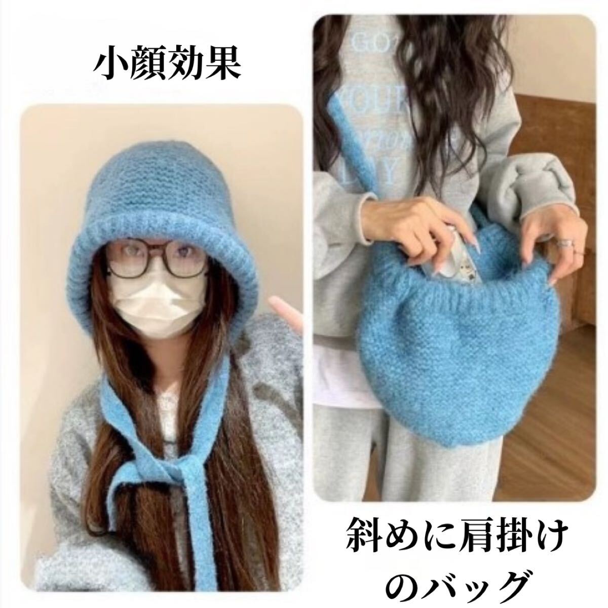 耳当て付き ニット帽 防寒 帽子 韓国風 レディース かわいいリボン ブルー バッグになる 匿名配送
