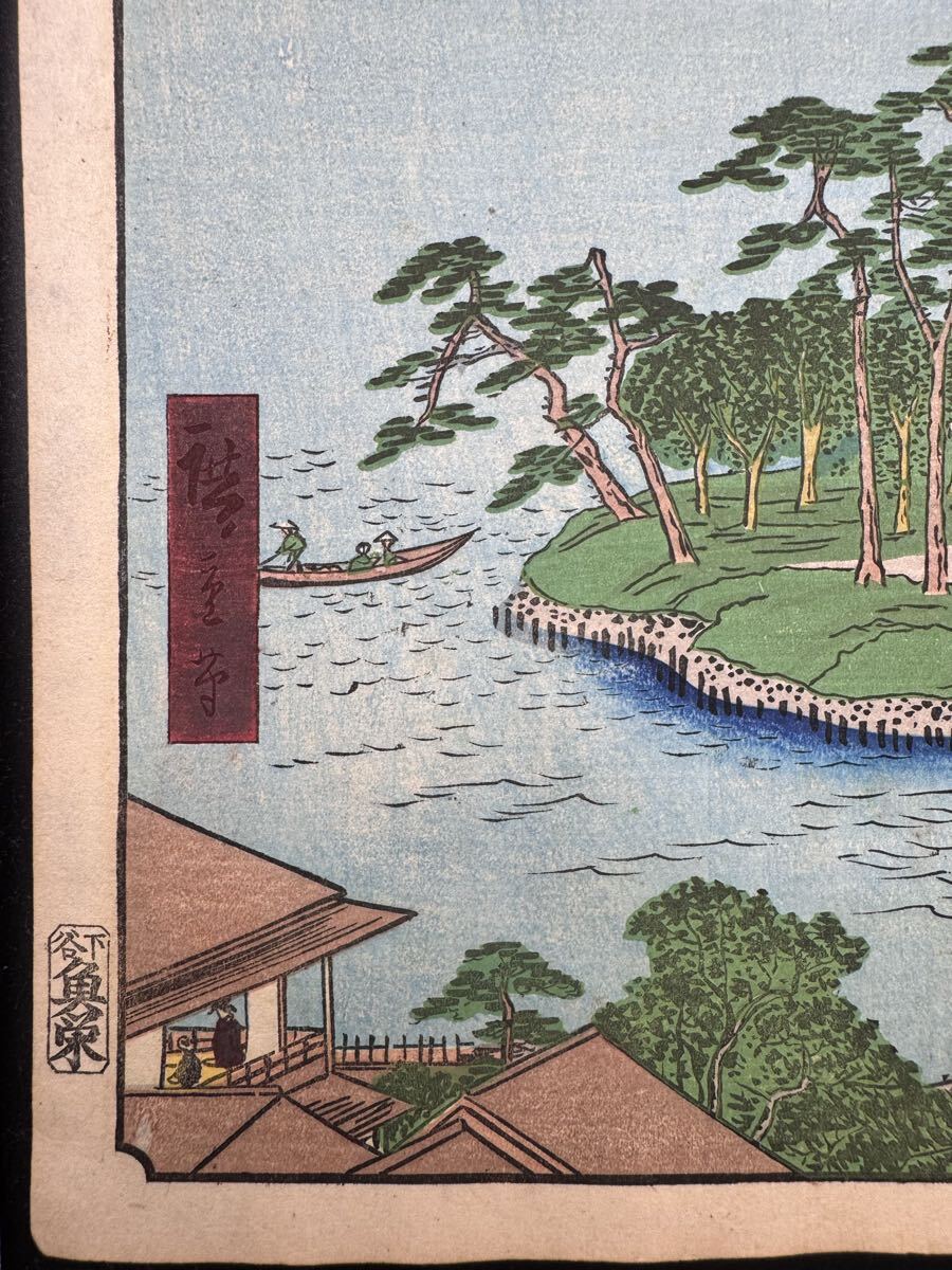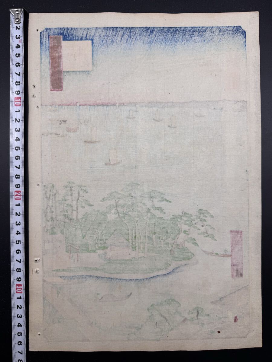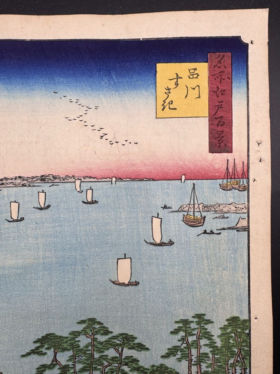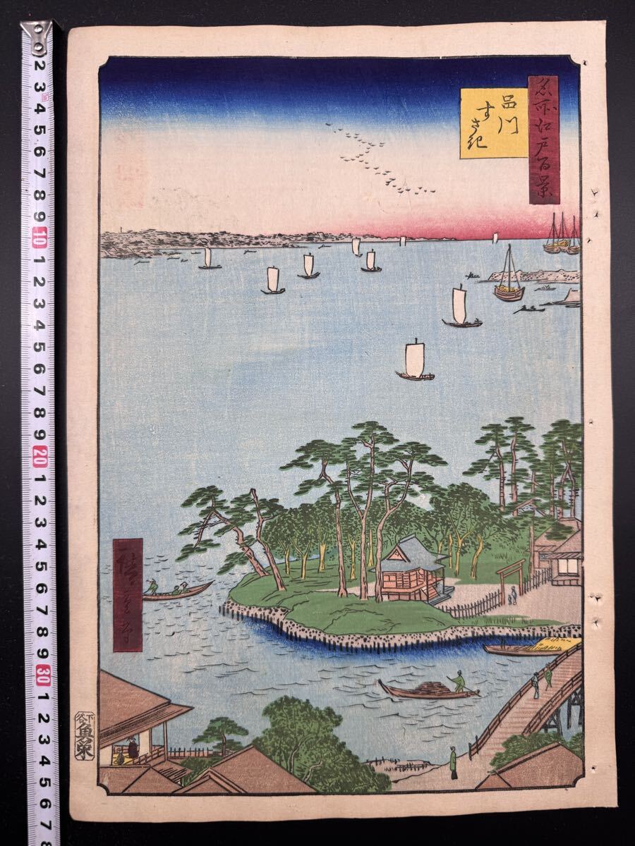 【真作】名作!本物浮世絵木版画 初代 歌川広重「名所江戸百景 品川すさき」江戸期 名所絵 大判 錦絵 保存良い