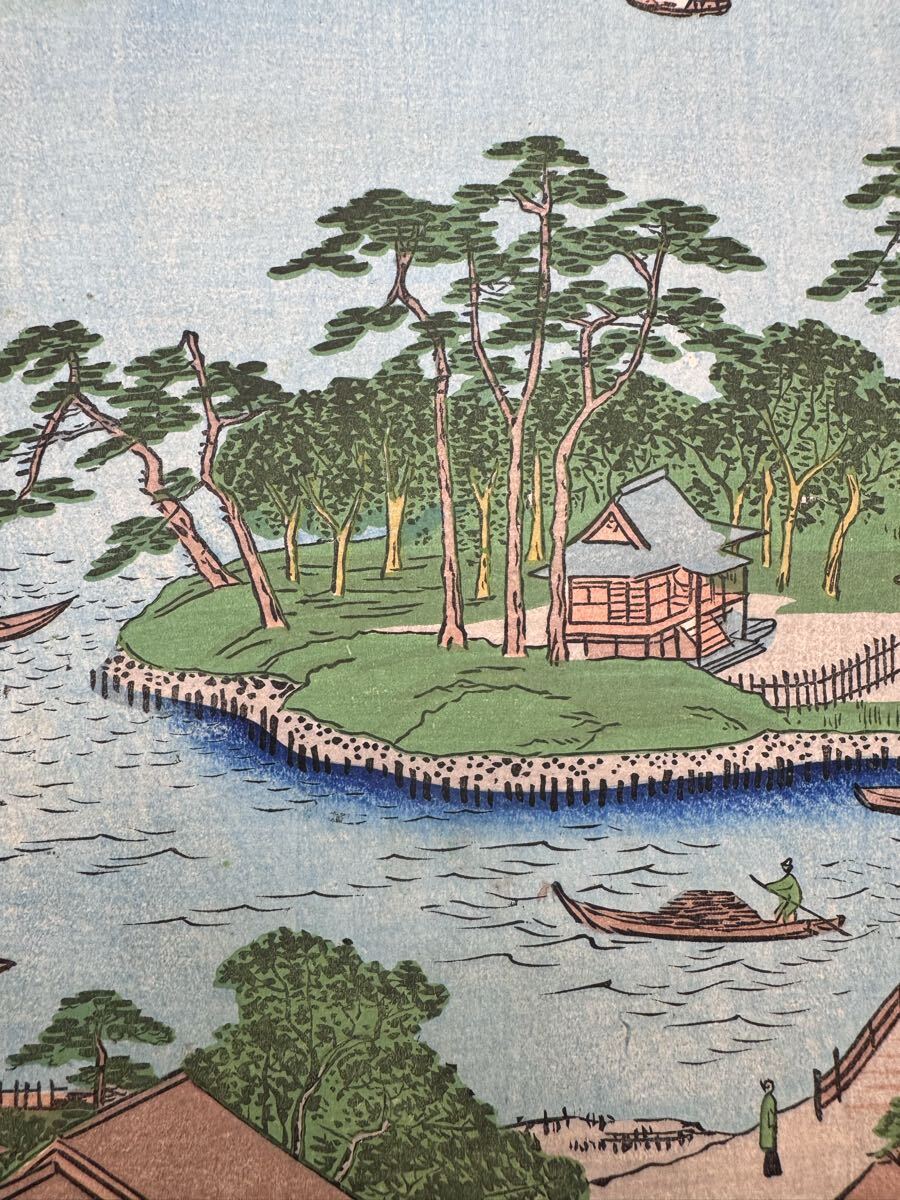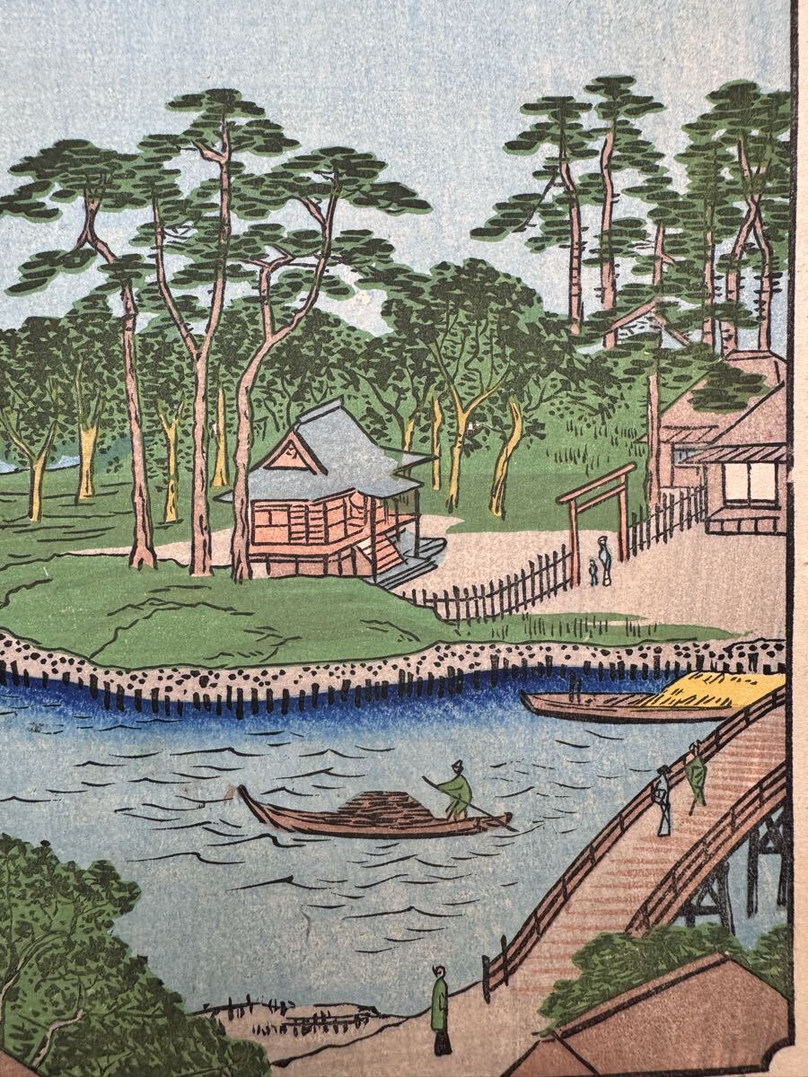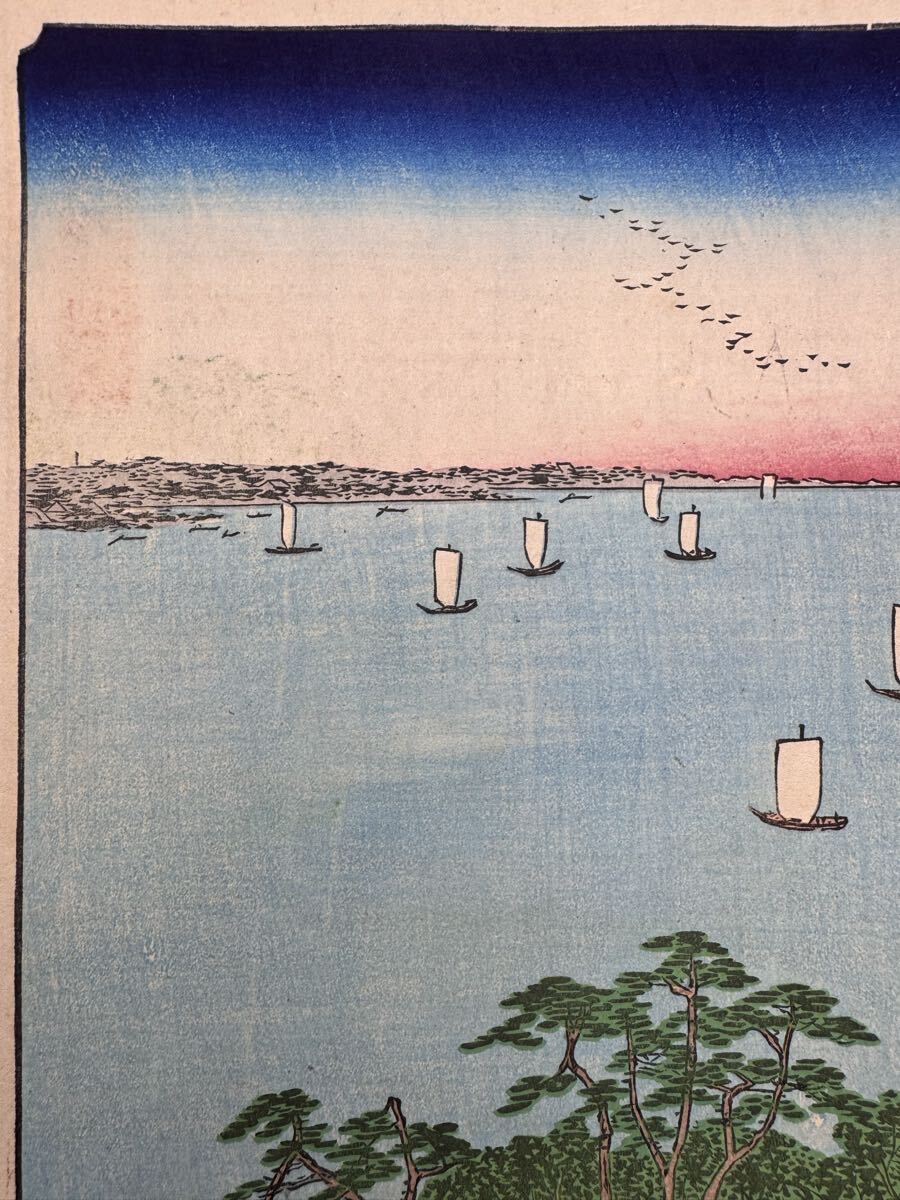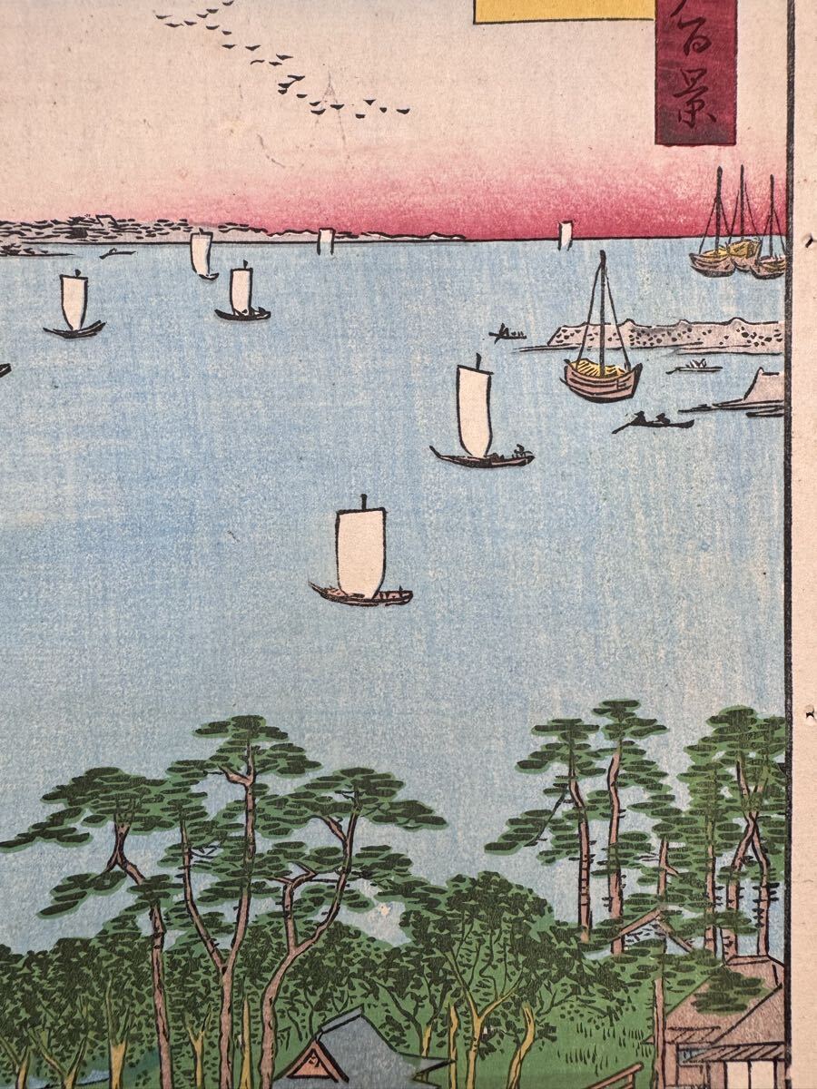 【真作】名作!本物浮世絵木版画 初代 歌川広重「名所江戸百景 品川すさき」江戸期 名所絵 大判 錦絵 保存良い