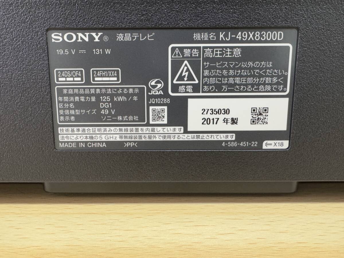 SONY Android 4K 液晶テレビ BRAVIA 49型 LED ソニー2017年製 KJ-49X8300D YouTubeやNetflix TVer Hulu Amazon Prime Video  管理SL228