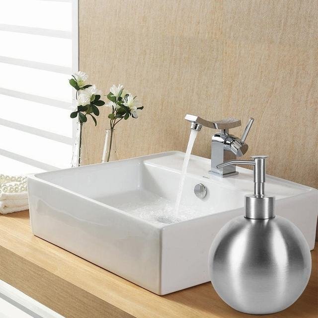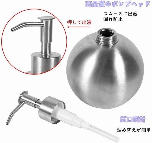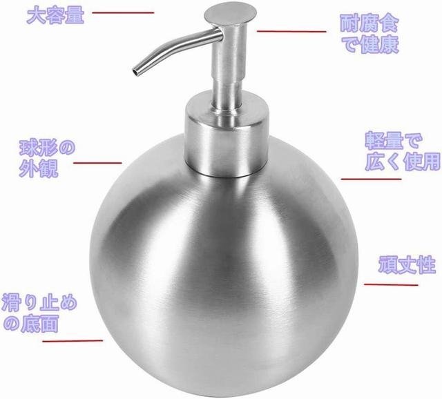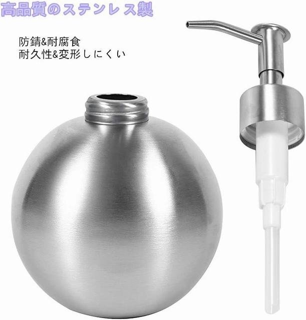【高品質ステンレス鋼製】 石鹸ディスペンサーは高品質の304ステンレス鋼で作られ、耐酸性、耐腐食性と研磨仕上げプロセス、耐久性と使用中の安全性に優れています。 【詰め替えが簡単】ポンプデザインは、ポンプヘッドの上部を押して石けんを分注するだけです。 【広く使用されるディスペンサー】シャワージェル、液体シャンプー、ローション石けん、抗菌石けんなどを、環境にやさしく実用的に繰り返して塗ることができます。 【使いやすい】トップパーツを解体することができ、広い口から液体を簡単に補充することができます。 【魅力的な外観】球形の外観の良い仕上がりは、装飾として使用することができます、バスルームやキッチンに最適です。 【注意事項】:ポンプヘッドのデザインは予告なしで変わる可能性がございます。ご了承ください。
