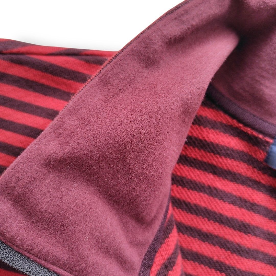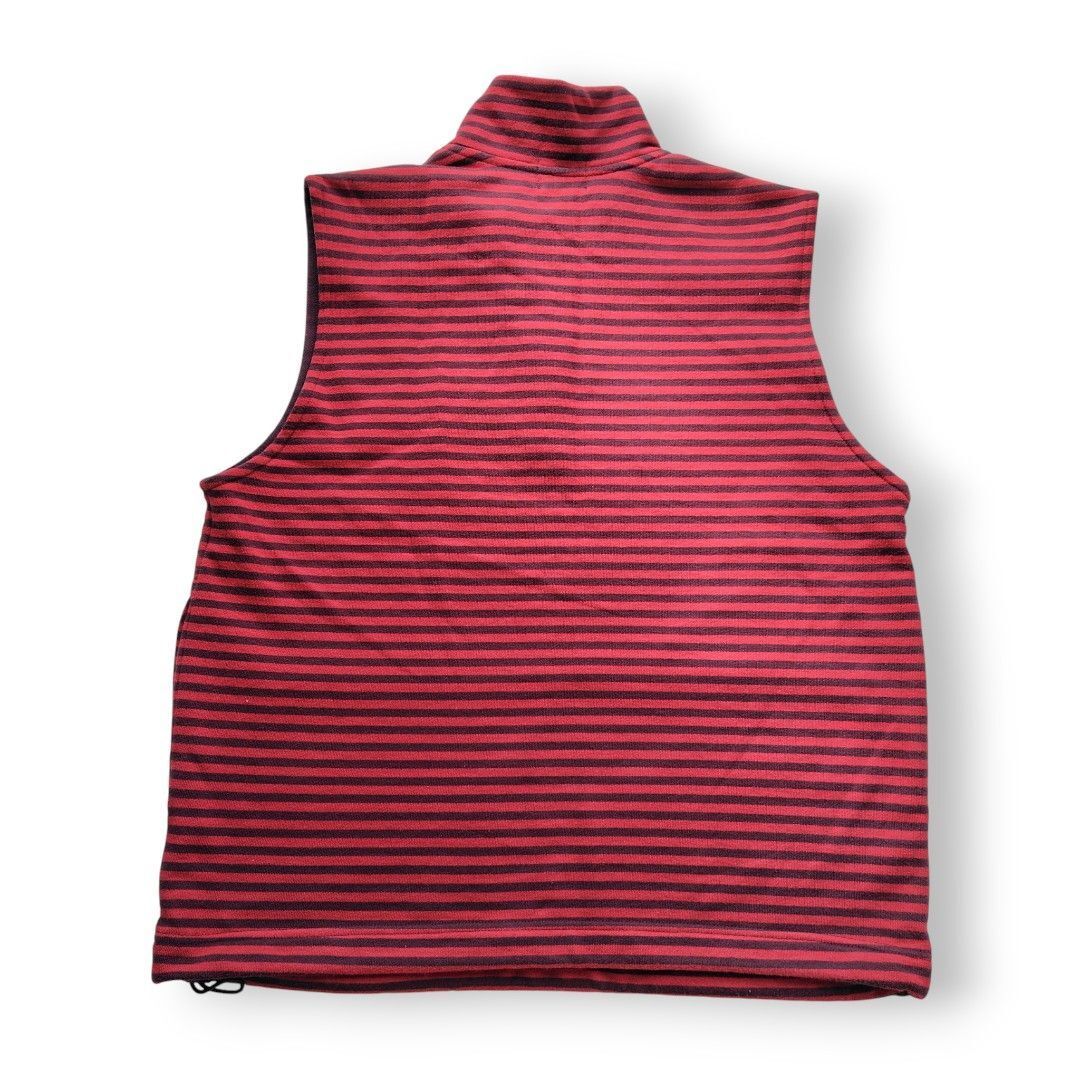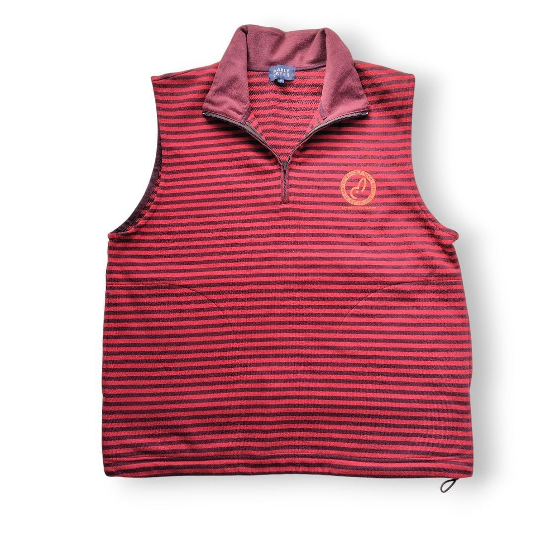 こちらは、レッド×ダークネイビーのボーダー柄が印象的なハーフジップベスト。