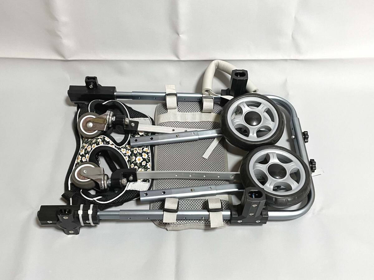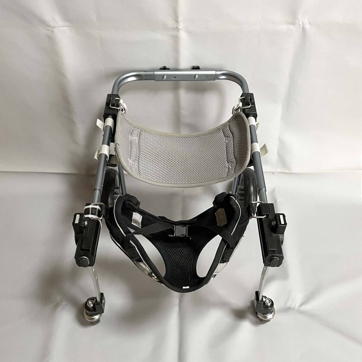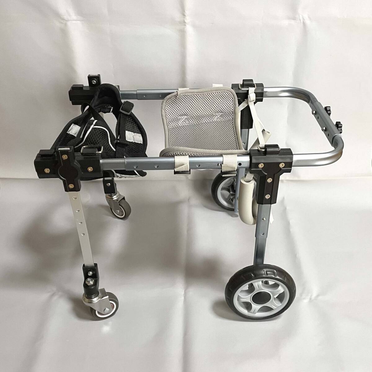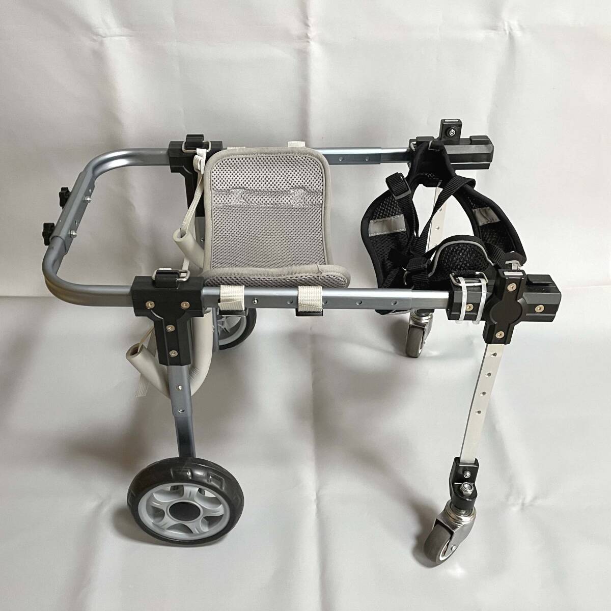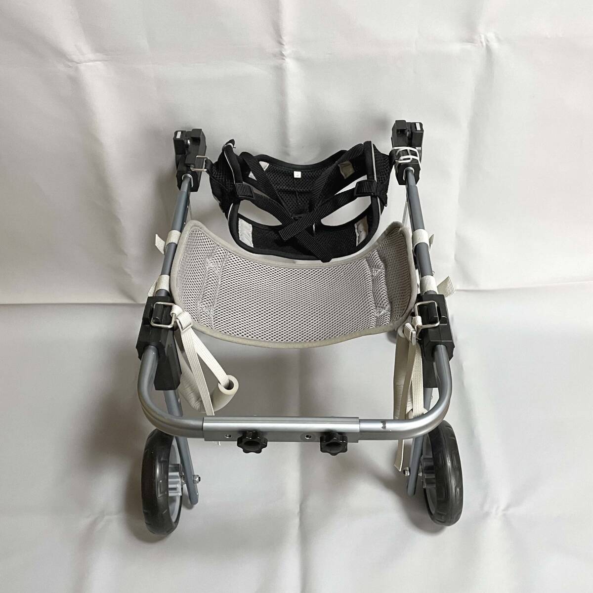 飼い犬の怪我が治ったので出品します。室内で4ヶ月ほど使用しました。幅・長さ・高さ調節可能です。現在は体重10kgのワンちゃんに合わせてあります。プラスチックパーツの一部が欠けてしまったので結束バンドで補修してありますが使用上問題ありませんでした(画像5)。発送は画像6のようにタイヤを外した状態で梱包しますが組み立てはプラスドライバー1本で可能です。