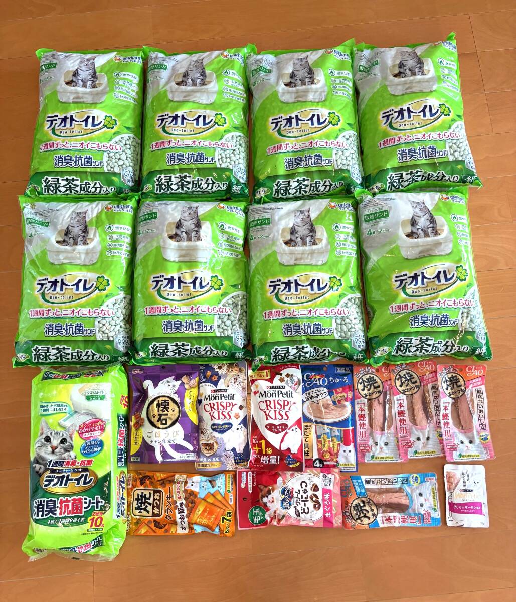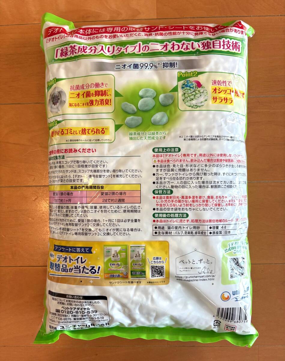 新品・未使用 ユニ・チャーム デオトイレ 飛び散らない緑茶成分入り消臭サンド 4Lは8袋& デオトイレ 消臭・抗菌シート1袋&おやつ一杯