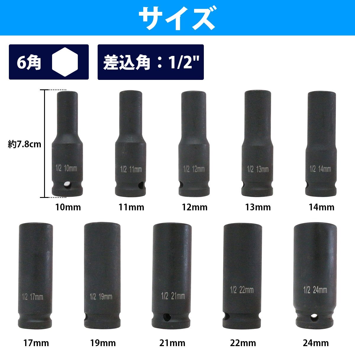 1/2 インパクト用 ディープ ソケット レンチ ケース付 10点セット アダプター 10pcs 工具 アルミホイール 差込角 1/2インチ