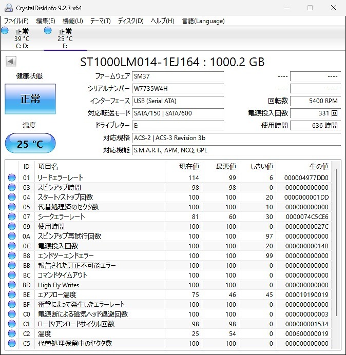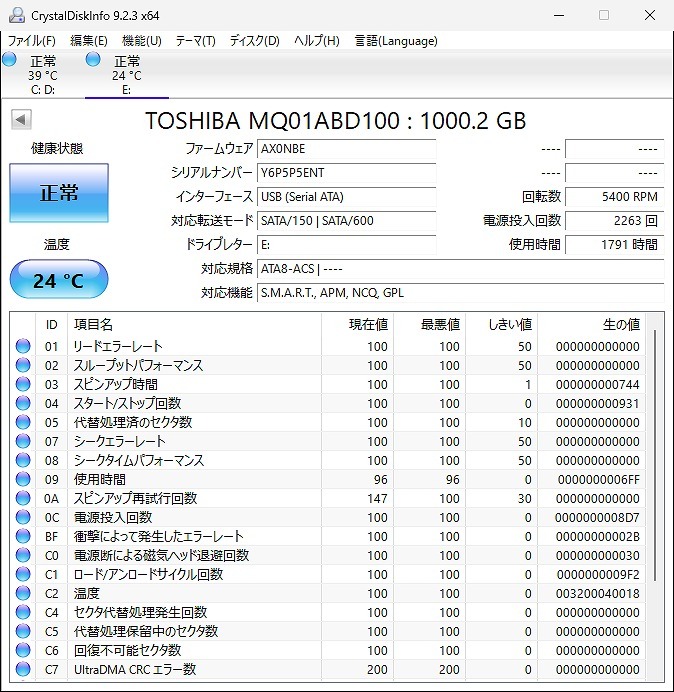CrystalDiskInfoの状態はすべて正常でした。