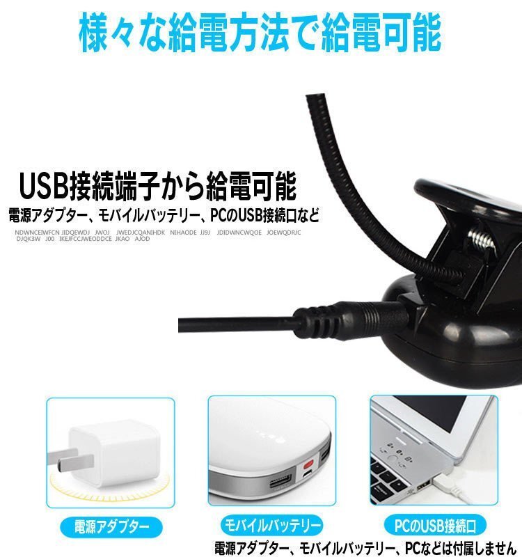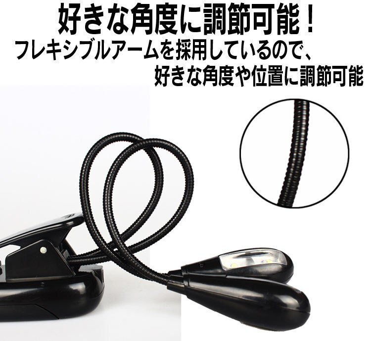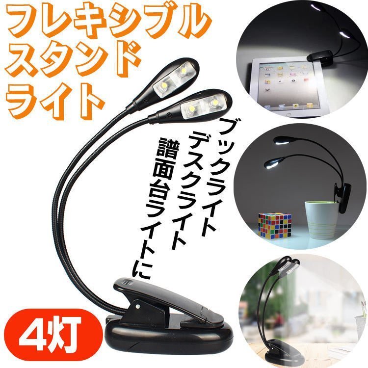 ◆クリップ型フレキシブルスタンドライト 2本 4灯LED ブックライト 譜面台ライト 乾電池またUSB給電 BOOKL22