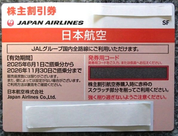 ●JAL 株主優待割引券●2026年11月30日まで有効●番号 通知●