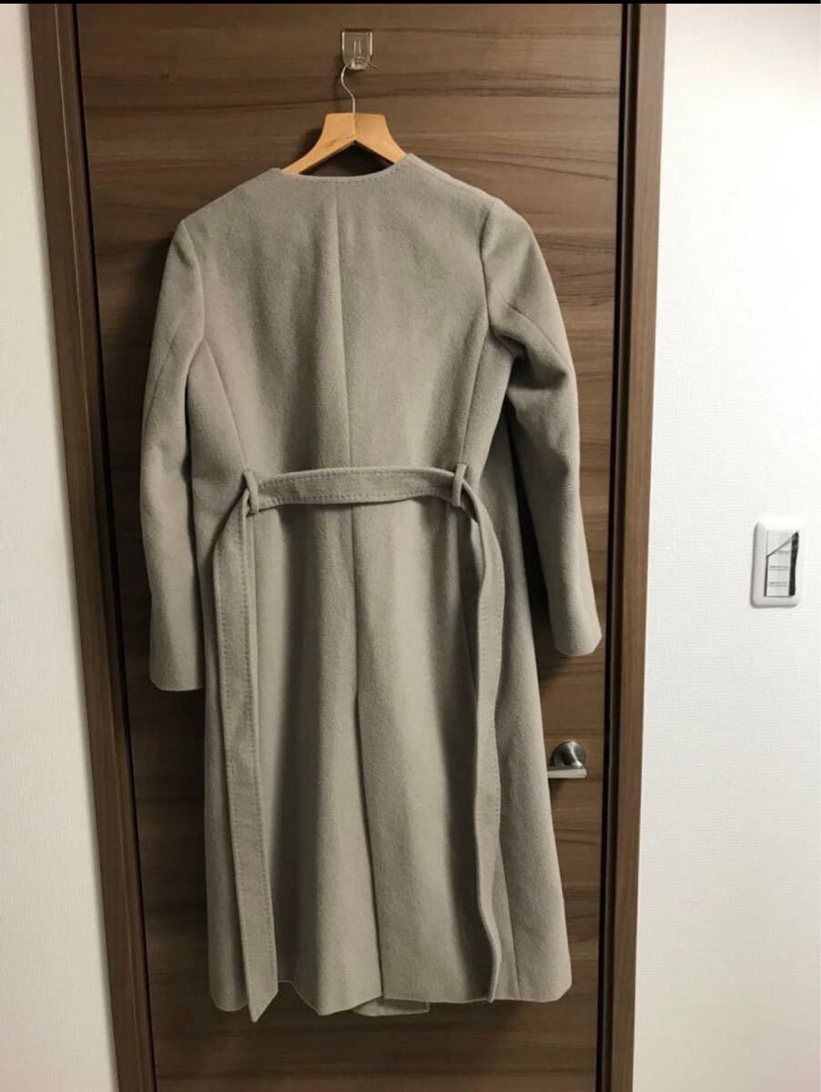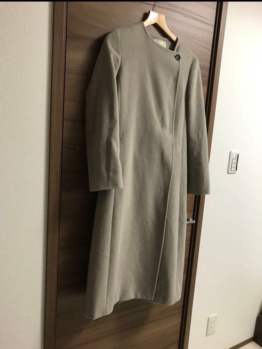 シンプルなデザインのベージュノーカラーコート。