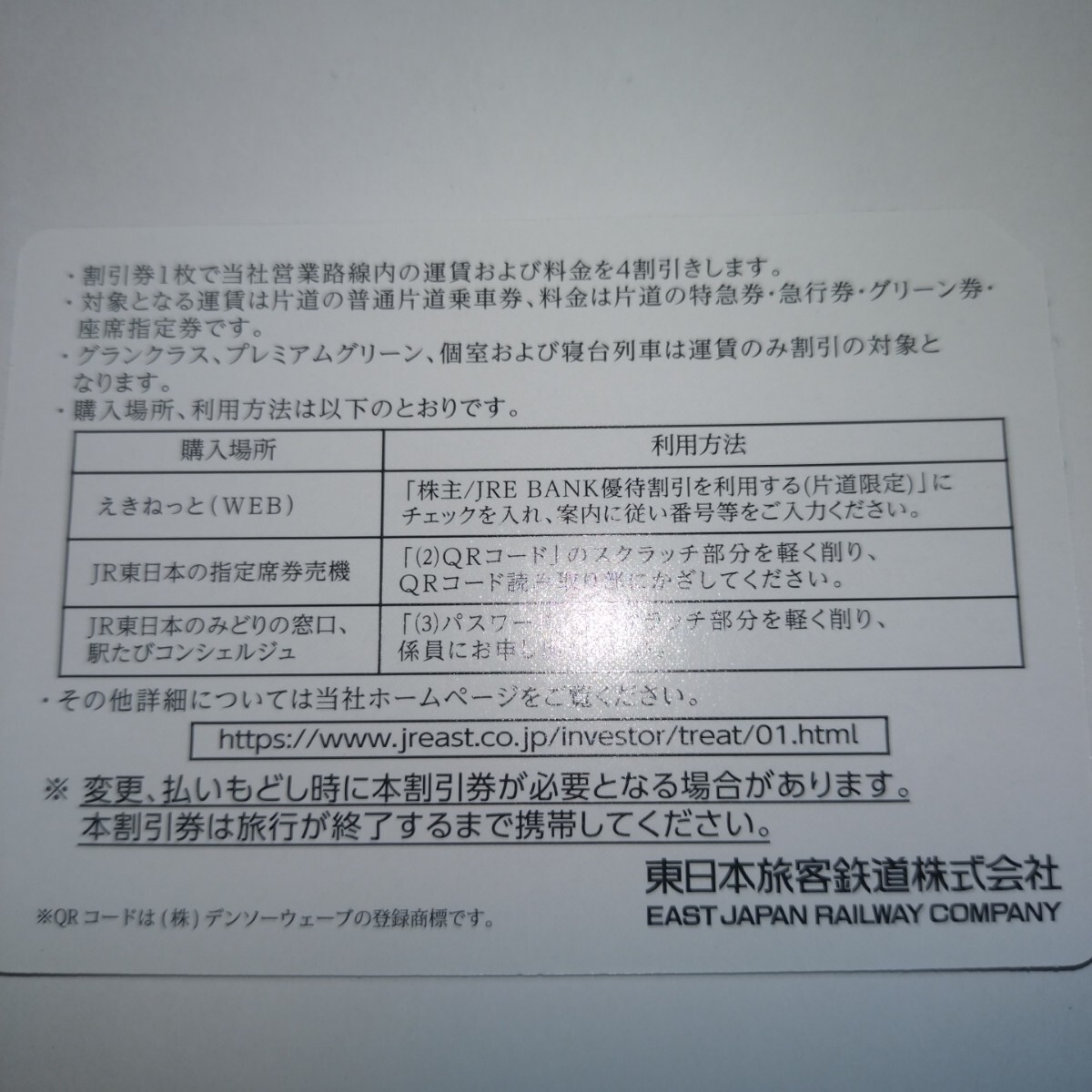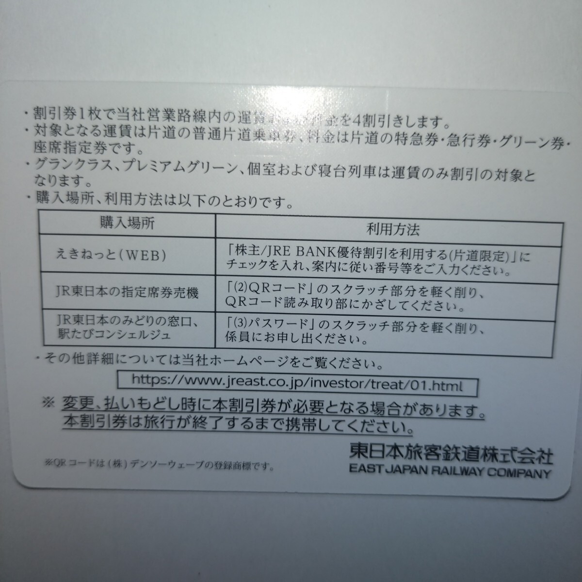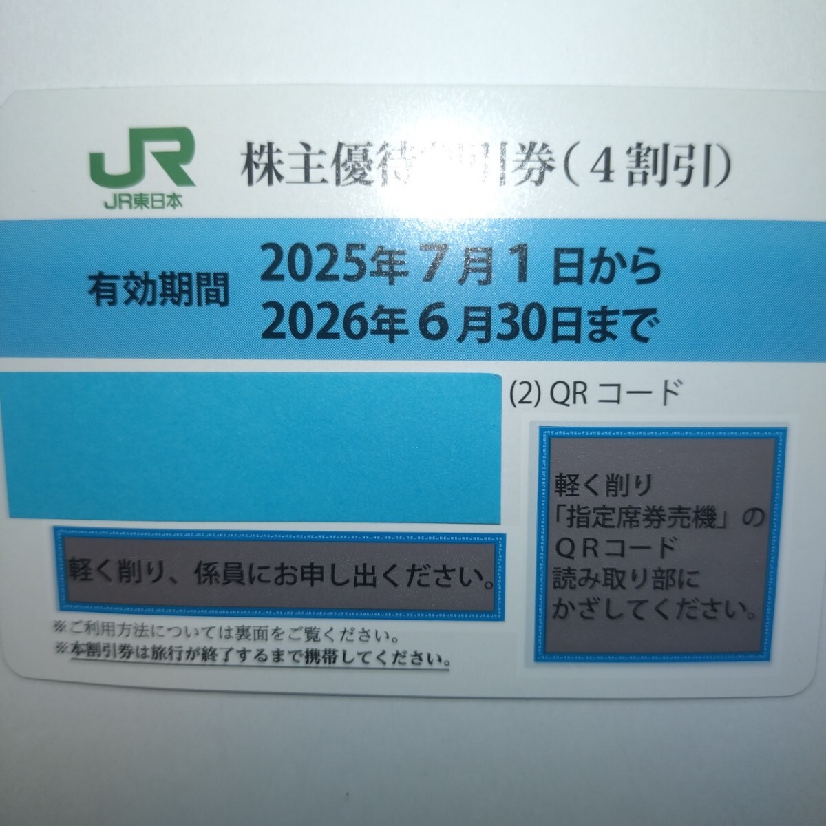 JR東日本 株主優待割引券(4割引き)1枚、番号通知可です。